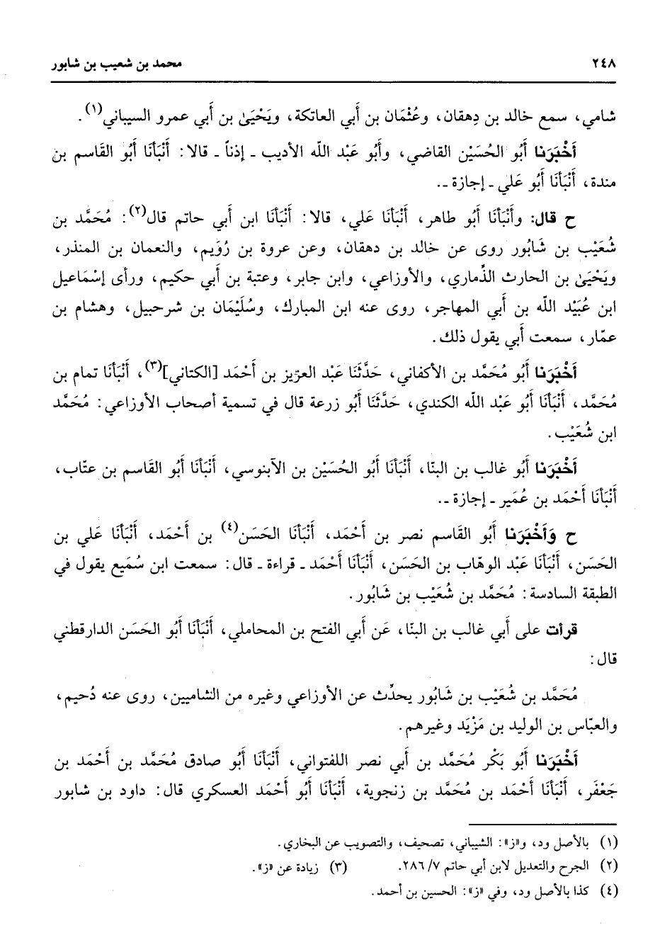 شامي سمع خالد بن دهقان وعثمان بن أبي العاتكة ويحيى بن أبي عمرو السيباني (1) أخبرنا أبو الحسين القاضي وأبو عبد الله الأديب إذنا قالا أنبأنا أبو القاسم بن مندة أنبأنا أبو علي إجازة ح قال وأنبأنا أبو طاهر أنبأنا علي قالا أنبأنا ابن أبي حاتم قال (2) محمد بن شعيب بن شابور روى عن خالد بن دهقان وعن عروة بن رويم والنعمان بن المنذر ويحيى بن الحارث الذماري والأوزاعي وابن جابر وعتبة بن أبي حكيم ورأى إسماعيل ابن عبيد الله بن أبي المهاجر روى عنه ابن المبارك وسليمان بن شرحبيل وهشام بن عمار سمعت أبي يقول ذلك أخبرنا أبو محمد بن الأكفاني حدثنا عبد العزيز بن أحمد الكتاني (3) أنبأنا تمام بن محمد أنبأنا أبو عبد الله الكندي حدثنا أبو زرعة قال في تسمية أصحاب الأوزاعي محمد بن شعيب أخبرنا أبو غالب بن البنا أنبأنا أبو الحسين بن الآبنوسي أنبأنا أبو القاسم بن عتاب أنبأنا أحمد بن عمير إجازة ح وأخبرنا أبو القاسم نصر بن أحمد أنبأنا الحسن (4) بن أحمد أنبأنا علي بن الحسن أنبأنا عبد الوهاب بن الحسن أنبأنا أحمد قراءة قال سمعت ابن سميع يقول في الطبقة السادسة محمد بن شعيب بن شابور قرأت على أبي غالب بن البنا عن أبي الفتح بن المحاملي أنبأنا أبو الحسن الدارقطني قال محمد بن شعيب بن شابور يحدث عن الأوزاعي وغيره من الشاميين روى عنه دحيم والعباس بن الوليد بن مزيد وغيرهم أخبرنا أبو بكر محمد بن أبي نصر اللفتواني أنبأنا أبو صادق محمد بن أحمد بن جعفر أنبأنا أحمد بن محمد بن زنجوية أنبأنا أبو أحمد العسكري قال داود بن شابور