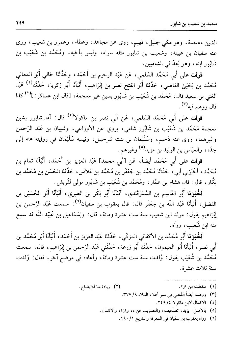 الشين معجمة وهو مكي جليل فهيم روى عن مجاهد وعطاء وعمرو بن شعيب روى عنه سفيان بن عيينة وشعيب بن شابور مثله سواء وليس بأخيه ومحمد بن شعيب بن شابور ابنه وهو يعد في الشاميين قرأت على أبي محمد السلمي عن عبد الرحيم بن أحمد وحدثنا خالي أبو المعالي محمد بن يحيى القاضي حدثنا أبو الفتح نصر بن إبراهيم أنبأنا أبو زكريا حدثنا (1) عبد الغني بن سعيد قال محمد بن شعيب بن شابور بسين غير معجمة قال ابن عساكر (2) كذا قال ووهم فيه (3) قرأت على أبي محمد السلمي عن أبي نصر بن ماكولا (4) قال أما شابور بشين معجمة محمد بن شعيب بن شابور شامي يروي عن الأوزاعي وشيبان بن عبد الرحمن وغيرهما روى عنه دحيم وسليمان بن بنت شرحبيل ونسبه سليمان في روايته عنه إلى جده والعباس بن الوليد بن مزيد (5) وغيرهم قرأت على أبي محمد أيضا عن أبي محمد عبد العزيز بن أحمد أنبأنا تمام بن محمد أخبرني أبي حدثنا محمد بن جعفر بن محمد بن ملاس حدثنا الحسن بن محمد بن بكار قال قال هشام بن عمار ومحمد بن شعيب بن شابور مولى لقريش أخبرنا أبو القاسم بن السمرقندي أنبأنا أبو بكر بن الطبري أنبأنا أبو الحسين بن الفضل أنبأنا عبد الله بن جعفر قال قال يعقوب بن سفيان (6) سمعت عبد الرحمن بن إبراهيم يقول مولد ابن شعيب سنة ست عشرة ومائة قال وإسماعيل بن عبيد الله قد سمع منه ابن شعيب ورآه أخبرنا أبو محمد بن الأكفاني المزكي حدثنا عبد العزيز بن أحمد أنبأنا أبو محمد بن أبي نصر أنبأنا أبو الميمون حدثنا أبو زرعة حدثني عبد الرحمن بن إبراهيم قال سمعت محمد بن شعيب يقول ولدت سنة ست عشرة ومائة وأعادة في موضع آخر فقال ولدت سنة ثلاث عشرة