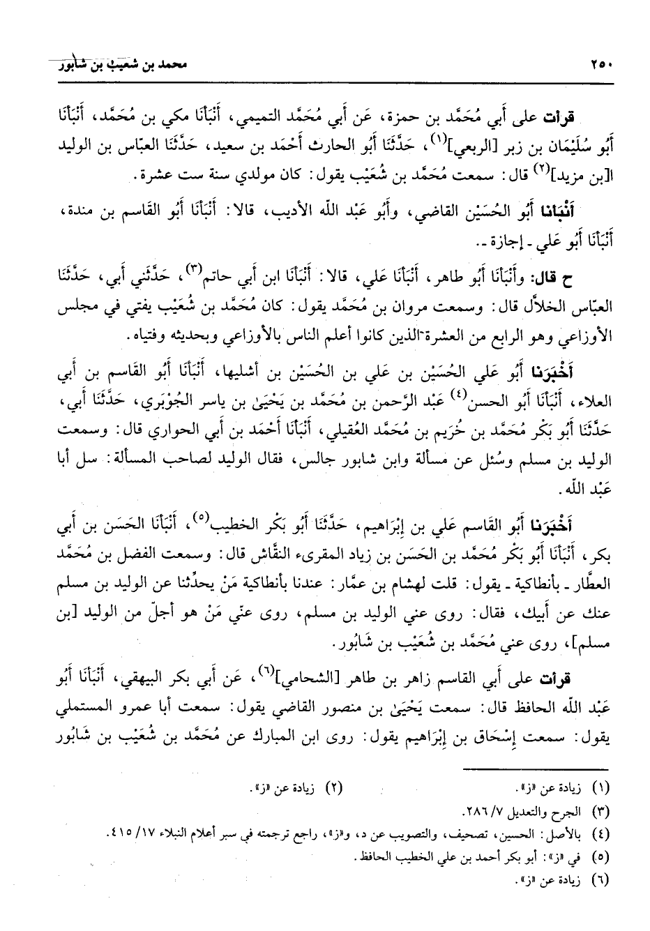 قرأت على أبي محمد بن حمزة عن أبي محمد التميمي أنبأنا مكي بن محمد أنبأنا أبو سليمان بن زبر الربعي (1) حدثنا أبو الحارث أحمد بن سعيد حدثنا العباس بن الوليد ابن ابن مزيد (2) قال سمعت محمد بن شعيب يقول كان مولدي سنة ست عشرة أنبأنا أبو الحسين القاضي وأبو عبد الله الأديب قالا أنبأنا أبو القاسم بن مندة أنبأنا أبو علي إجازة ح قال وأنبأنا أبو طاهر أنبأنا علي قالا أنبأنا ابن أبي حاتم (3) حدثني أبي حدثنا العباس الخلال قال وسمعت مروان بن محمد يقول كان محمد بن شعيب يفتي في مجلس الأوزاعي وهو الرابع من الشعرة الذين كانوا أعلم الناس بالأوزاعي وبحديثه وفتياه أخبرنا أبو علي الحسين بن علي بن الحسين بن أشليها أنبأنا أبو القاسم بن أبي العلاء أنبأنا أبو الحسن (4) عبد الرحمن بن محمد بن يحيى بن ياسر الجوبري حدثنا أبي حدثنا أبو بكر محمد بن خريم بن محمد العقيلي أنبأنا أحمد بن أبي الحواري قال وسمعت الوليد بن مسلم وسئل عن مسألة وابن شابور جالس فقال الوليد لصاحب المسألة سل أبا عبد الله أخبرنا أبو القاسم علي بن إبراهيم حدثنا أبو بكر الخطيب (5) أنبأنا الحسن بن أبي بكر أنبأنا أبو بكر محمد بن الحسن بن زياد المقرئ النقاش قال وسمعت الفضل بن محمد العطار بأنطاكية يقول قلت لهشام بن عمار عندنا بأنطاكية من يحدثنا عن الوليد بن مسلم عنك عن أبيك فقال روى عني الوليد بن مسلم روى عني من هو أجل من الوليد بن مسلم روى عني محمد بن شعيب بن شابور قرأت على أبي القاسم زاهر بن طاهر الشحامي (6) عن أبي بكر البيهقي أنبأنا أبو عبد الله الحافظ قال سمعت يحيى بن منصور القاضي يقول سمعت أبا عمرو المستملي يقول سمعت إسحاق بن إبراهيم يقول روى ابن المبارك عن محمد بن شعيب بن شابور