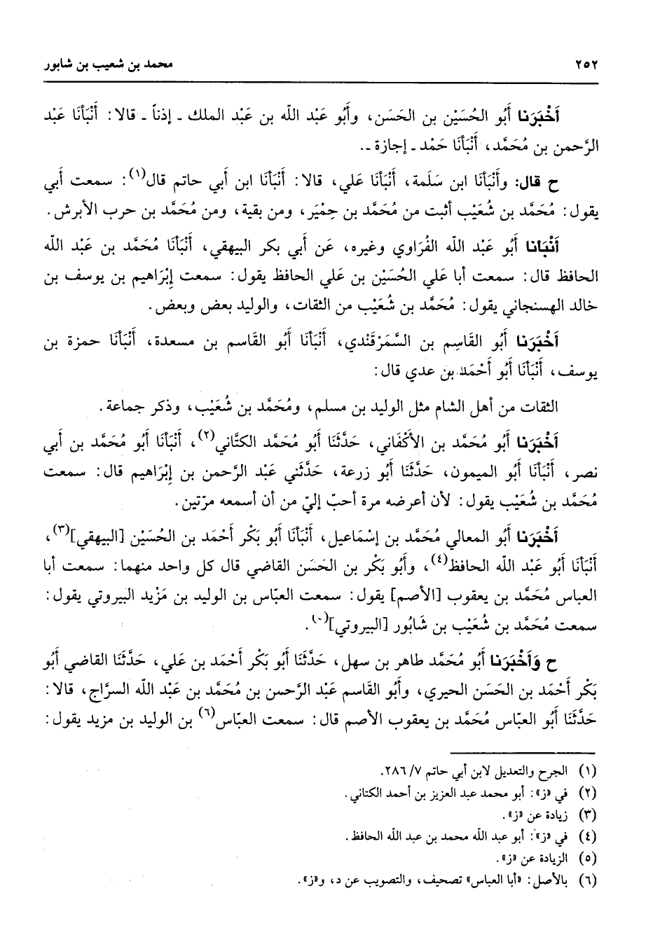 أخبرنا أبو الحسين بن الحسن وأبو عبد الله بن عبد الملك إذنا قالا أنبأنا عبد الرحمن بن محمد أنبأنا حمد إجازة ح قال وأنبأنا ابن سلمة أنبأنا علي قالا أنبأنا ابن أبي حاتم قال (1) سمعت أبي يقول محمد بن شعيب أثبت من محمد بن حمير ومن بقية ومن محمد بن حرب الأبرش أنبأنا أبو عبد الله الفراوي وغيره عن أبي بكر البيهقي أنبأنا محمد بن عبد الله الحافظ قال سمعت أبا علي الحسين بن علي الحافظ يقول سمعت إبراهيم بن يوسف بن خالد الهسنجاني يقول محمد بن شعيب من الثقات والوليد بعض وبعض أخبرنا أبو القاسم بن السمرقندي أنبأنا أبو القاسم بن مسعدة أنبأنا حمزة بن يوسف أنبأنا أبو أحمد بن عدي قال الثقات من أهل الشام مثل الوليد بن مسلم ومحمد بن شعيب وذكر جماعة خبرنا أخبرنا أبو محمد بن الأكفاني حدثنا أبو محمد الكتاني (2) أنبأنا أبو محمد بن أبي نصر أنبأنا أبو الميمون حدثنا أبو زرعة حدثني عبد الرحمن بن إبراهيم قال سمعت محمد بن شعيب يقول لأن أعرضه مرة أحب إلي من أن أسمعه مرتين أخبرنا أبو المعالي محمد بن إسماعيل أنبأنا أبو بكر أحمد بن الحسين البيهقي (3) أنبأنا أبو عبد الله الحافظ (4) وأبو بكر بن الحسن القاضي قال كل واحد منهما سمعت أبا العباس محمد ين يعقوب الأصم يقول سمعت العباس بن الوليد بن مزيد البيروتي يقول سمعت محمد بن شعيب بن شابور البيروتي (5) ح وأخبرنا أبو محمد طاهر بن سهل حدثنا أبو بكر أحمد بن علي حدثنا القاضي أبو بكر أحمد بن الحسن الحيري وأبو القاسم عبد الرحمن بن محمد بن عبد الله السراج قالا حدثنا أبو العباس محمد بن يعقوب الأصم قال سمعت العباس (6) بن الوليد بن مزيد يقول