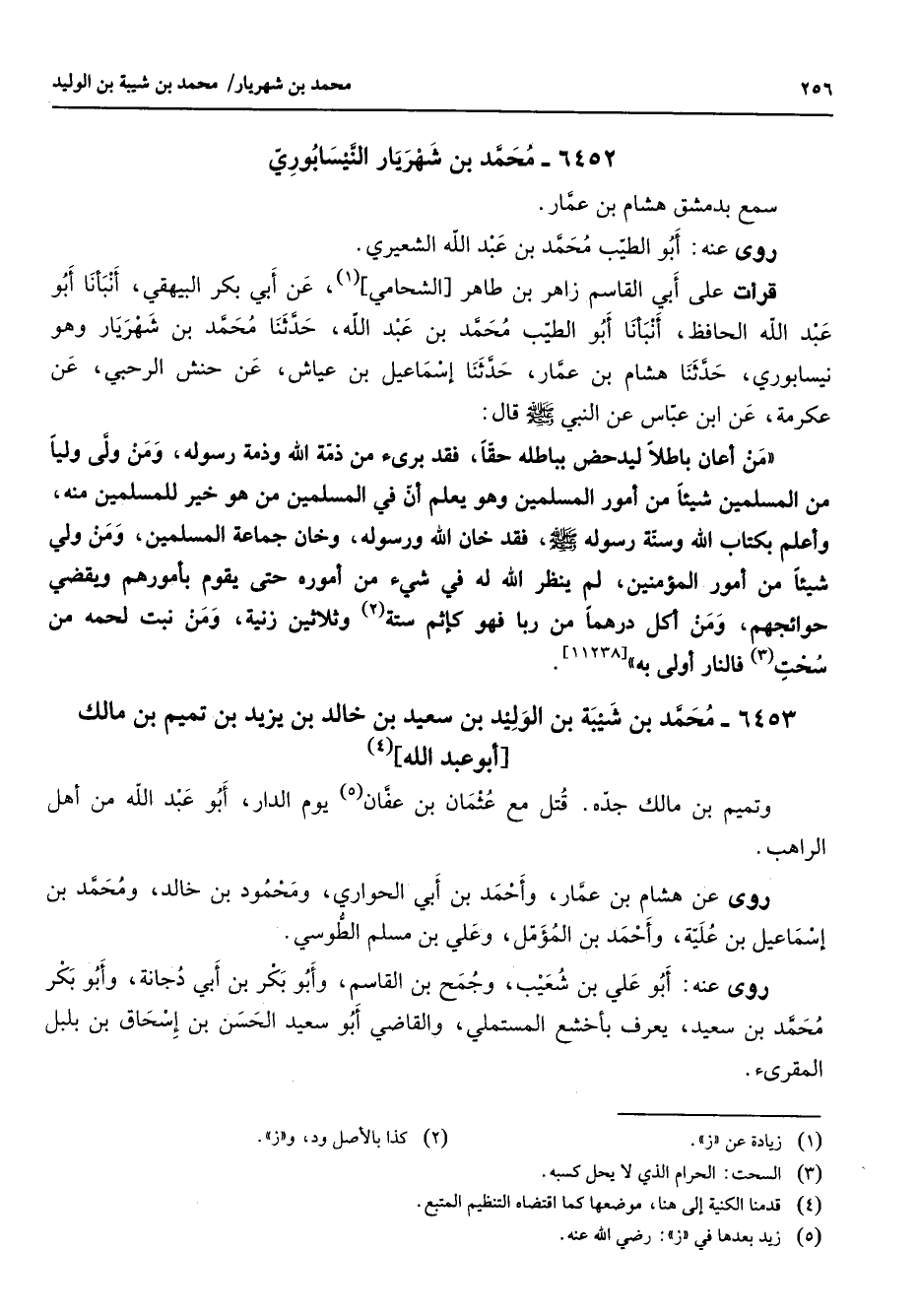 6452 - محمد بن شهريار النيسابوري سمع بدمشق هشام بن عمار روى عنه أبو الطيب محمد بن عبد الله الشعيري قرأت على أبي القاسم زاهر بن طاهر الشحامي (1) عن أبي بكر البيهقي أنبأنا أبو عبد الله الحافظ أنبأنا أبو الطيب محمد بن عبد الله حدثنا محمد بن شهريار وهو نيسابوري حدثنا هشام بن عمار حدثنا إسماعيل بن عياش عن حنش الرحبي عن عكرمة عن ابن عباس عن النبي (صلى الله عليه وسلم) قال من أعان باطلا ليدحض بباطله حقا قد برئ من ذمة الله وذمة رسوله ومن ولي وليا من المسلمين شيئا من أمور المسلمين وهو يعلم أن في المسلمين من هو خير للمسلمين منه وأعلم بكتاب الله وسنة رسوله (صلى الله عليه وسلم) فقد خان الله ورسوله وخان جماعة المسلمين ومن ولي شيئا من أمور المؤمنين لم ينظر الله له في شئ من أموره حتى يقوم بأمورهم ويقضي حوائجهم ومن أكل درهما من ربا فهو كإثم ستة (2) وثلاثين زنية ومن نبت لحمه من سحت فالنار أولى به