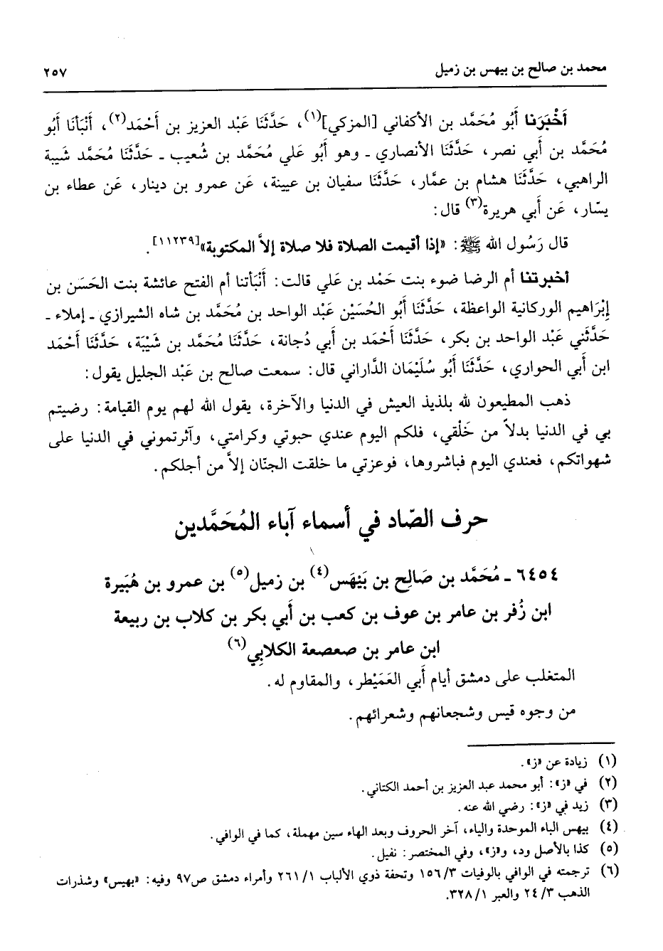6454 - محمد بن صالح بن بيهس (4) بن زميل (5) بن عمرو بن هبيرة ابن زفر بن عامر بن عوف بن كعب بن أبي بكر بن كلاب بن ربيعة ابن عامر بن صعصعة الكلابي (6) المتغلب على دمشق أيام أبي العميطر والمقاوم له من وجوه قيس وشجعانهم وشعرائهم