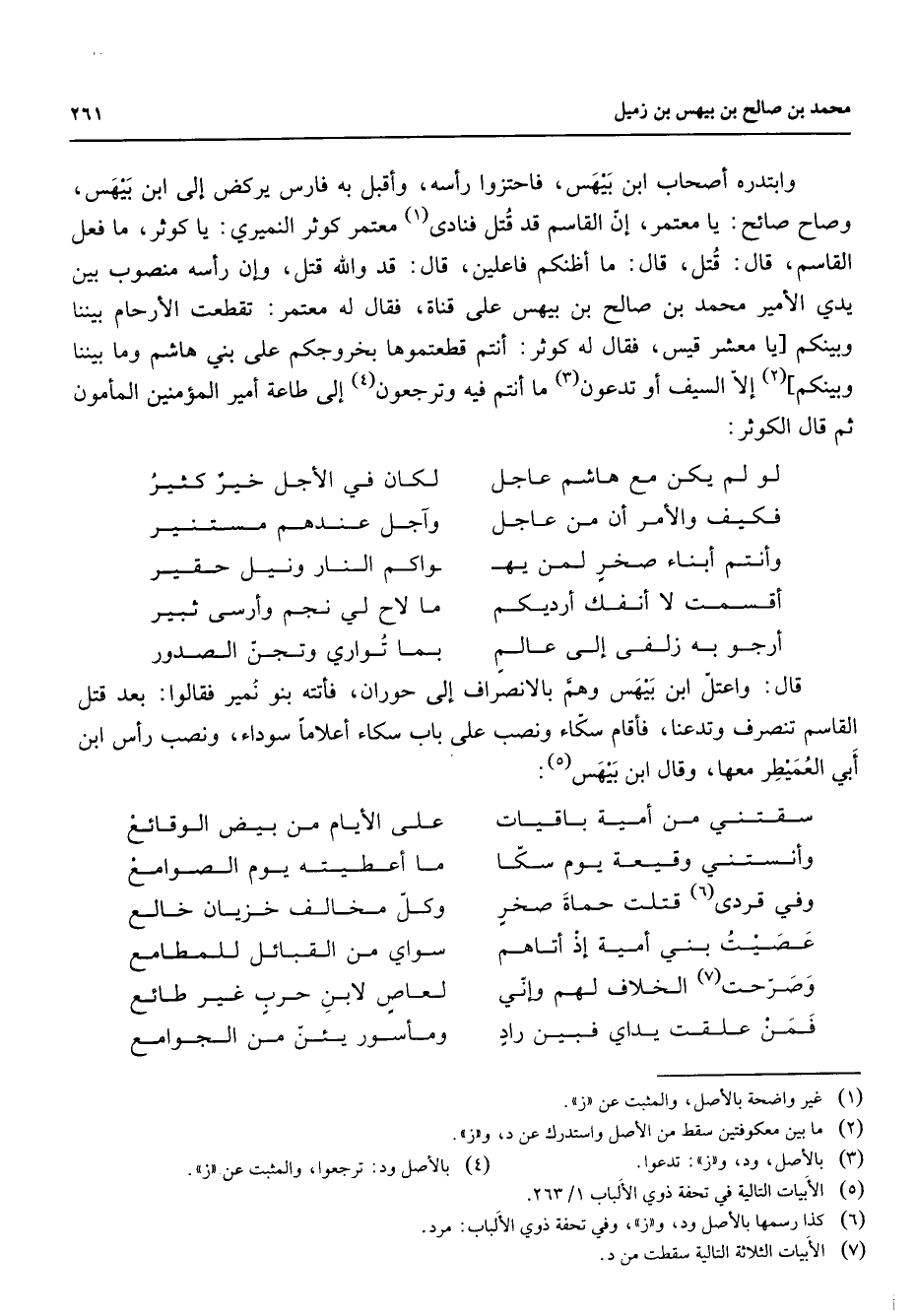 وابتدره أصحاب ابن بيهس فاحتزوا رأسه وأقبل به فارس يركض إلى ابن بيهس وصاح صائح يا معتمر إن القاسم قد قتل فنادى (1) معتمر كوثر النميري يا كوثر ما فعل القاسم قال قتل قال ما أظنكم فاعلين قال قد والله قتل وإن رأسه منصوب بين يدي الأمير محمد بن صالح بن بيهس على قناة فقال له معتمر تقطعت الأرحام بيننا وبينكم يا معشر قيس فقال له كوثر أنتم قطعتموها بخروجكم على بني هاشم وما بيننا وبينكم (2) إلا السيف أوتدعون (3) ما أنتم فيه وترجعون (4) إلى طاعة أمير المؤمنين المأمون ثم قال الكوثر * لو لم يكن مع هاشم عاجل * لكان في الأجل خير كثير فكيف والأمر أن من عاجل * وآجل عندهم مستنير وأنتم أبناء صخر لمن يه * واكم النار ونيل حقير أقسمت لا أنفك أرديكم * ما لاح لي نجم وأرسى ثبير أرجو به زلفى إلى عالم * بما تواري وتجن الصدور * قال واعتل ابن بيهس وهم بالانصراف إلى حوارن فأتته بنو نمير فقالوا بعد قتل القاسم تنصرف وتدعنا فأقام سكاء ونصب على باب سكاء أعلاما سوداء ونصب رأس ابن أبي العميطر معها وقال ابن بيهس (5) * سقتني من أمية باقيات * على الأيام من بيض الوقائع وأنستني وقيعة يوم سكا * ما أعطيته يوم الصوامع وفي قردى (6) قتلت حماة صخر * وكل مخالف خزيان خالع عصيت بني أمية إذ أتاهم * سواي من القبائل للمطامع وصرحت (7) الخلاف لهم وإني * لعاص لابن حرب غير طائع فمن علقت يداي فبين راد * ومأسور يئن من الجوامع