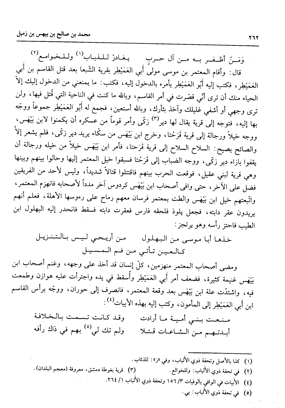 ومن أظفر به من آل حرب * يغادر للذباب (1) وللخوامع (2) * قال وأقام المعتمر بن موسى مولى أبي العميطر بقرية الشبعا بعد قتل القاسم بن أبي العميطر فكتب إليه أبو العميطر يأمره بالدخول إليه فكتب ما يمنعني من الدخول إليك إلا ياء الحياء منك أن ترى أني قصرت في أمر القاسم وبالله ما كنت في الناحية التي قتل فيها ولن ترى وجهي أو أشفي غليلك وآخذ بثأرك وبالله أستعين فجمع له أبو العميطر جموعا ووجه بها إليه فتوجه إلى قرية يقال لها دير (3) زكى وأمر قوما من عسكره أن يكمنوا لابن بيهس ووجه خيلا ورجالة إلى قرية قرحتا وخرج ابن بيهس من سكاء يريد دير زكى فلم يشعر إلا والصائح يصيح السلاح السلاح إلى قرية قرحتا فأمر ابن بيهس خيلا من خيله ورجالة أن يقفوا بازاء دير زكى ووجه الضباب إلى قرحتا فسبقوا خيل المعتمر إليها وحالوا بينهم وبينها وهي قرية لبني عقيل فوقعت الحرب بينهم فاقتتلوا قتالا شديدا وليس لأحد من الفريقين فضل على الآخر حتى وافى أصحاب ابن بيهس كردوس آخر مددا لأصحابه فانهزم المعتمر واتبعهم خيل ابن بيهس والطت بمعتمر فرسان معهم رماح على رؤوسها الأهلة فعلم أنهم يريدون عقر دابته فجعل يلوذ فلحقه فارس فعقرت دابته فسقط فانحدر إليه البهلول ابن الطيب فاحتز رأسه وهو يرتجز * خذها أبا موسى من البهلول * من أريحي ليس بالتنزيل كالعين تأتي من فم المسيل * * ومضى أصحاب المعتمر منهزمين كل إنسان قد أخذ على وجهه وغنم أصحاب ابن بيهس غنيمة كثيرة فضعف أمر أبي العميطر وأسقط في يده واجترأت علي هوازن وطمعت فيه واشتدت علة ابن بيهس بعد وقعة المعتمر فانصرف إلى حوران ووجه برأس القاسم ابن أبي العميطر إلى المأمون وكتب إليه بهذه الأبيات * (4) منعت بني أمية ما أرادت * وقد كانت تسمت بالخلافة أبدتهم من الشاعات قتلا * ولم تك لي (5) بهم في ذاك رأفة
