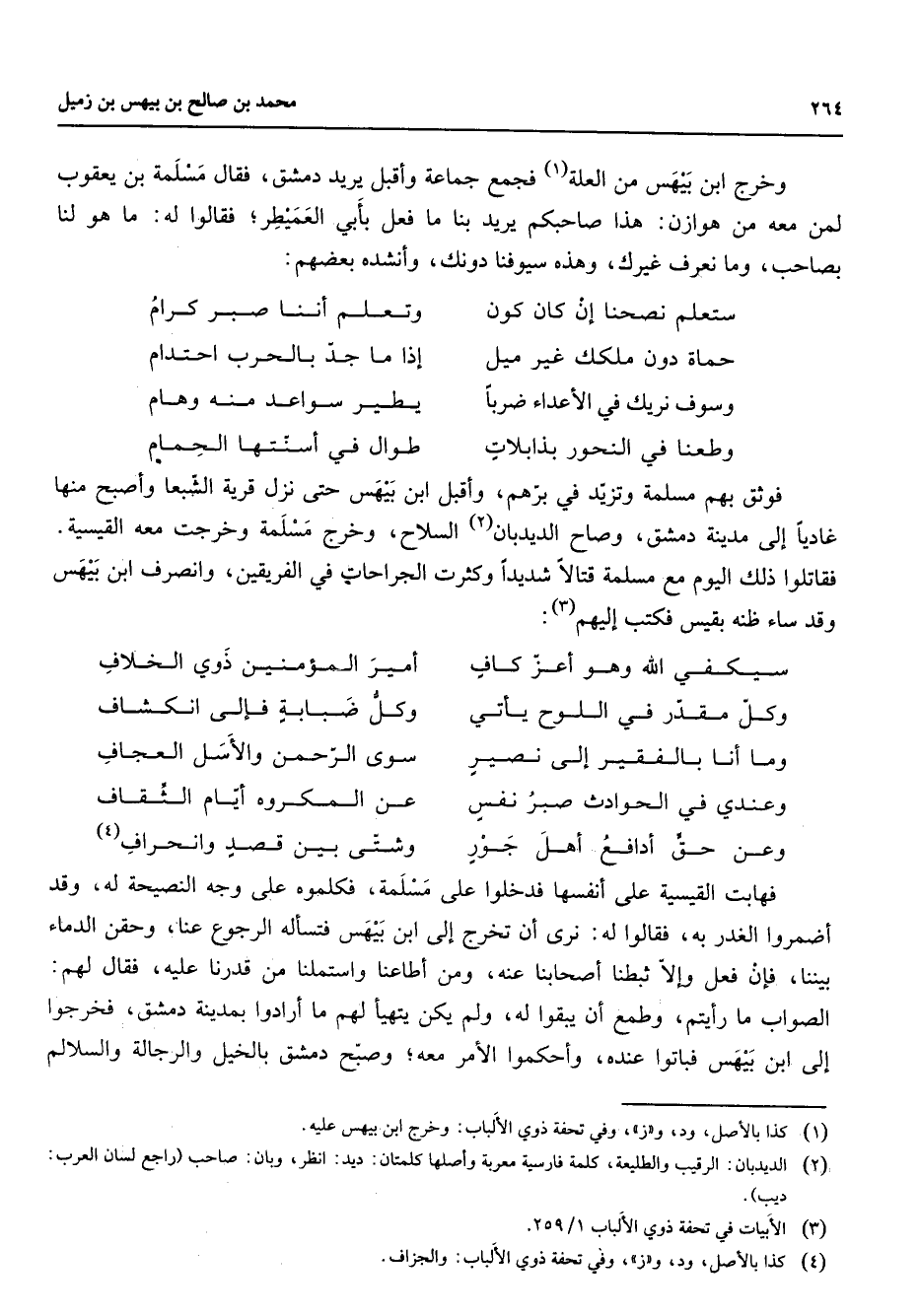 وخرج ابن بيهس من العلة (1) فجمع جماعة وأقبل يريد دمشق فقال مسلمة بن يعقوب لمن معه من هوازن هذا صاحبكم يريد بنا ما فعل بأبي العميطر فقالوا له ما هو لنا بصاحب وما نعرف غيرك وهذه سيوفنا دونك وأنشده بعضهم * ستعلم نصحنا إن كان كون * وتعلم أننا صبر كرام حماة دون ملكك غير ميل * إذا ما جد بالحرب احتدام وسوف نريك في الأعداء ضربا * يطير سواعد منه وهام وطعنا في النحور بذابلات * طوال في أسنتها الحمام * فوثق بهم مسلمة وتزيد في برهم وأقبل ابن بيهس حتى نزل قرية الشبعا وأصبح منها غاديا إلى مدينة دمشق وصاح الديدبان (2) السلاح وخرج مسلمة وخرجت معه القيسية فقاتلوا ذلك فقاتلوا ذلك اليوم مع مسلمة قتالا شديدا وكثرت الجراحات في الفريقين وانصرف ابن بيهس وقد ساء ظنه بقيس فكتب إليهم (3) * سيكفي الله وهو أعز كاف * أمير المؤمنين ذوي الخلاف ولك مقدر في اللوح يأتي * وكل ضبابة فإلى انكشاف وما أنا بالفقير إلى نصير * سوى الرحمن والأسل العجاف وعندي في الحوادث صبر نفس * عن المكروه أيام الثقاف وعن حق أدافع أهل جور * وشتى بين قصد وانحراف * (4) فهابت القيسية على أنفسها فدخلوا على مسلمة فكلموه على وجه النصيحة له وقد أضمروا الغدر به فقالوا له نرى أن تخرج إلى ابن بيهس فتسأله الرجوع عنا وحقن الدماء بيننا فإن فعل وإلا ثبطنا أصحابنا عنه ومن أطاعنا واستملنا من قدرنا عليه فقال لهم الصواب ما رأيتم وطمع أن يبقوا له ولم يكن يتهيأ لهم ما أرادوا بمدينة دمشق فخرجوا إلى ابن بيهس فباتوا عنده وأحكموا الأمر معه وصبح دمشق بالخيل والرجالة والسلالم