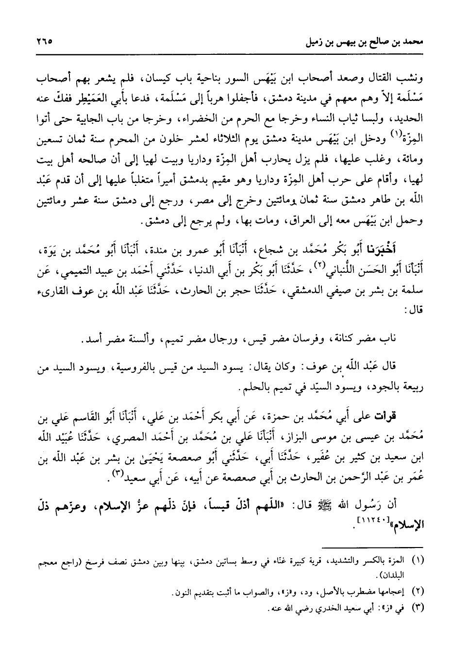 ونشب القتال وصعد أصحاب ابن بيهس السور بناحية باب كيسان فلم يشعر به أصحاب مسلمة إلا وهم معهم في مدينة دمشق فأجفلوا هربا إلى مسلمة فدعا بأبي العميطر ففك عنه الحديد ولبسا ثياب النساء وخرجا مع الحرم من الخضراء وخرجا من باب الجابية حتى أتوا المزة (1) ودخل ابن بيهس مدينة دمشق يوم الثلاثاء لعشر خلون من المحرم سنة ثمان تسعين ومائة وغلب عليها فلم يزل يحارب أهل المزة وداريا وبيت لهيا إلى أن صالحه أهل بيت لهيا وأقام على حرب أهل المزة وداريا وهو مقيم بدمشق أميرا متغلبا عليها إلى أن قدم عبد الله بن طاهر دمشق سنة ثمان ومائتين وخرج إلى مصر ورجع إلى دمشق سنة عشر ومائتين وحمل ابن بيهس معه إلى العراق ومات بها ولم يرجع إلى دمشق أخبرنا أبو بكر محمد بن شجاع أنبأنا أبو عمرو بن مندة أنبانا أبو محمد بن يوة أنبأنا أبو الحسن اللنباني (2) حدثنا أبو بكر بن أبي الدنيا حدثني أحمد بن عبيد التميمي عن سلمة بن بشر بن صيفي الدمشقي حدثنا حجر بن الحارث حدثنا عبد الله بن عوف القارئ قال ناب مضر كنانة وفرسان مضر قيس ورجال مضر تميم وألسنة مضر أسد قال عبد الله بن عوف وكان يقال يسود السيد من قيس بالفروسية ويسود السيد من ربيعة بالجود ويسود السيد في تميم بالحلم قرأت على أبي محمد بن حمزة عن أبي بكر أحمد بن علي أنبأنا أبو القاسم علي بن محمد بن عيسى بن موسى البزاز أنبأنا علي بن محمد بن أحمد المصري حدثنا عبيد الله ابن سعيد بن كثير بن عفير حدثنا أبي حدثني أبو صعصعة يحيى بن بشر بن عبد الله بن عمر بن عبد الرحمن بن الحارث بن أبي صعصعة عن أبيه عن أبي سعيد (3) أن رسول الله (صلى الله عليه وسلم) قال اللهم أذل قيسا فإن ذلهم عز الإسلام وعزهم ذل الإسلام