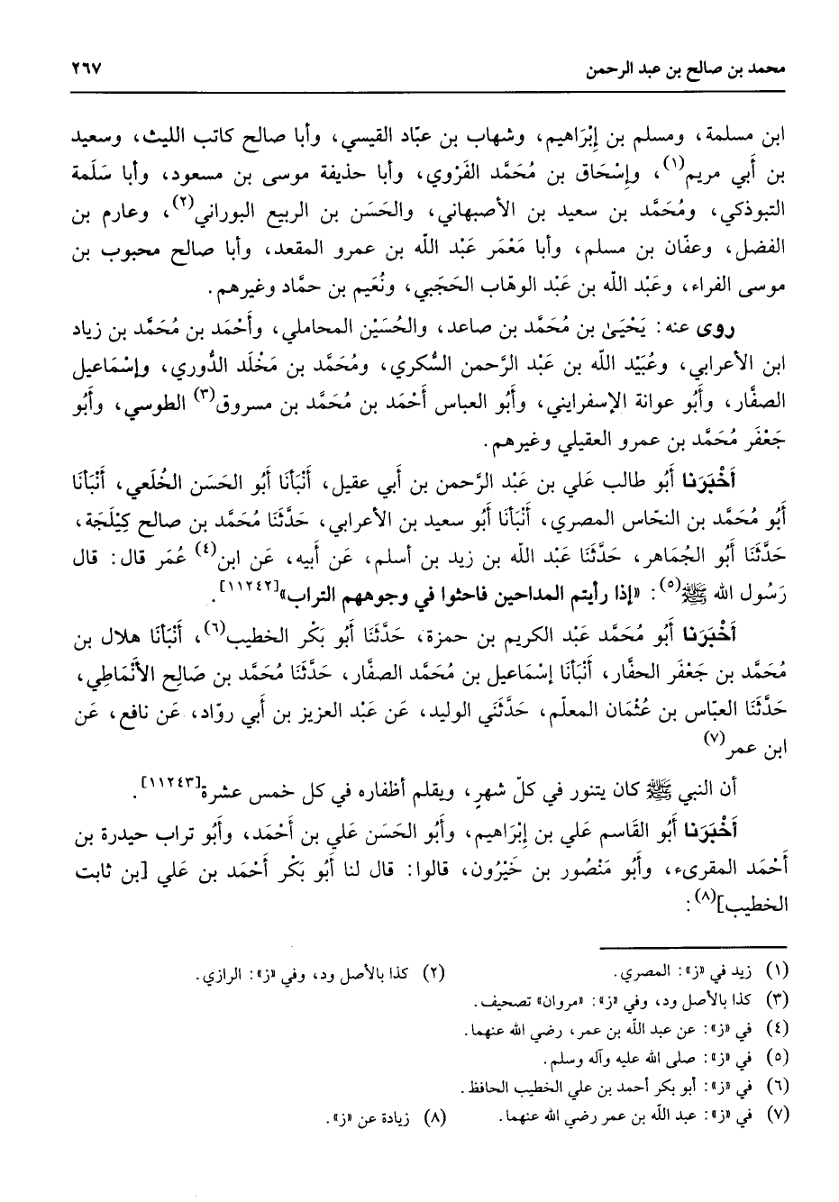 ابن مسلمة ومسلم بن إبراهيم وشهاب بن عباد القيسي وأبا صالح كاتب الليث وسعيد بن أبي مريم (1) وإسحاق بن محمد الفروي وأبا حذيفة موسى بن مسعود وأبا سلمة التبوذكي ومحمد بن سعيد بن الأصبهاني والحسن بن الربيع البوراني (2) وعارم بن الفضل وعفان بن مسلم وأبا معمر عبد الله بن عمرو المقعد وأباصالح محبوب بن موسى الفراء وعبد الله بن عبد الوهاب الحجبي ونعيم بن حماد وغيرهم روى عنه يحيى بن محمد بن صاعد والحسين المحاملي وأحمد بن محمد بن زياد ابن الأعرابي وعبيد الله بن عبد الرحمن السكري ومحمد بن مخلد الدوري وإسماعيل الصفار وأبو عوانة الإسفرايني وأبو العباس أحمد بن محمد بن مسروق (3) الطوسي وأبو جعفر محمد بن عمرو العقيلي وغيرهم أخبرنا أبو طالب علي بن عبد الرحمن بن أبي عقيل أنبأنا أبو الحسن الخلعي أنبأنا أبو محمد بن النحاس المصري أنبأنا أبو سعيد بن الأعرابي حدثنا محمد بن صالح كيلجة حدثنا أبو الجماهر حدثنا عبد الله بن زيد بن أسلم عن أبيه عن ابن (4) عمر قال قال رسول الله (صلى الله عليه وسلم) (5) إذا رأيتم المداحين فاحثوا في وجوههم التراب (11242 أخبرنا أبو محمد عبد الكريم بن حمزة حدثنا أبو بكر الخطيب (6) أنبأنا هلال بن محمد بن جعفر الحفار أنبأنا إسماعيل بن محمد الصفار حدثنا محمد بن صالح الأنماطي حدثنا العباس بن عثمان المعلم حدثني الوليد عن عبد العزيز بن أبي رواد عن نافع عن ابن عمر (7) أن النبي (صلى الله عليه وسلم) كان يتنور في كل شهر ويقلم أظفاره في كل خمس عشرة