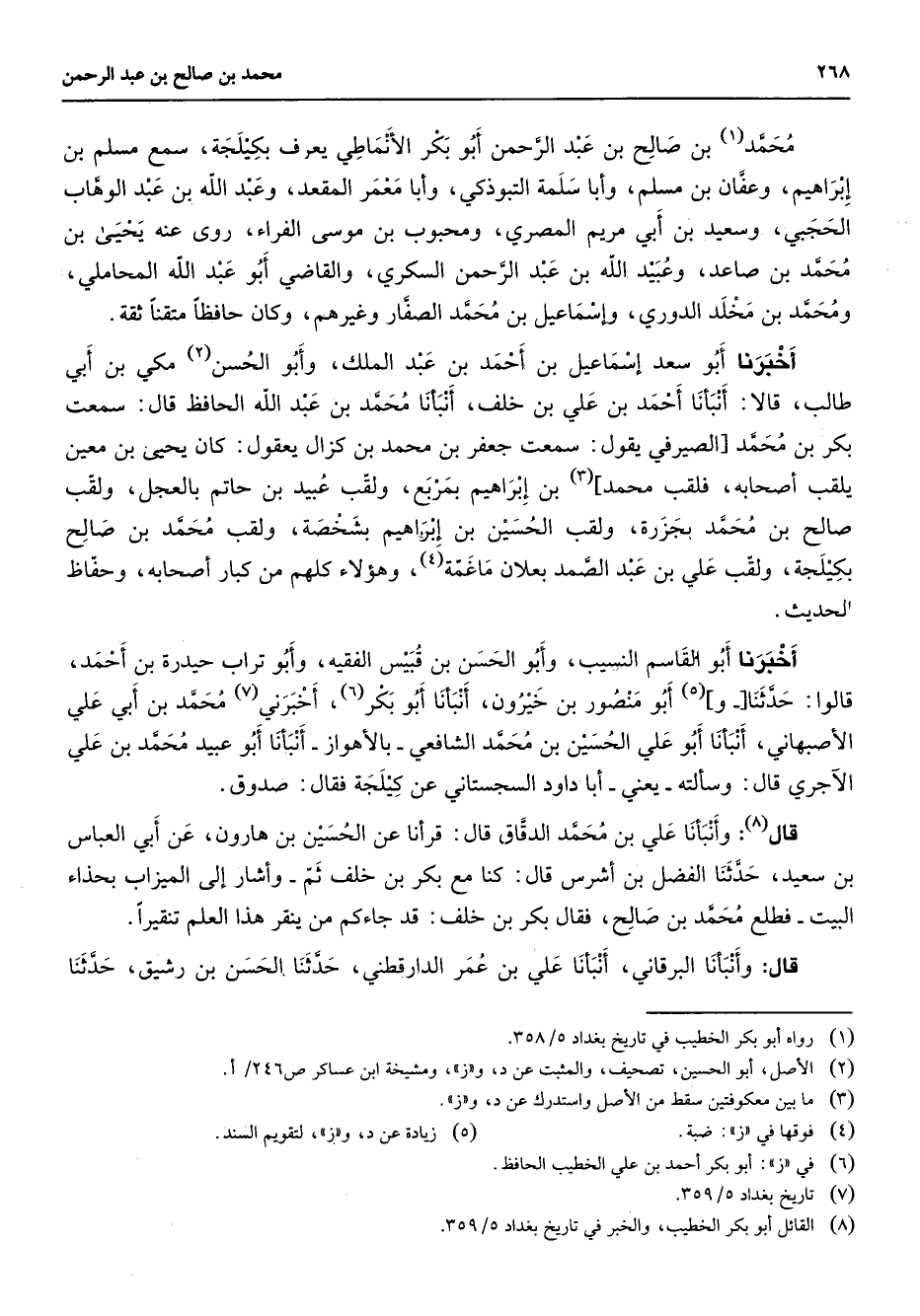 (8) القائل أبو بكر الخطيب والخبر في تاريخ بغداد 5 / 359
