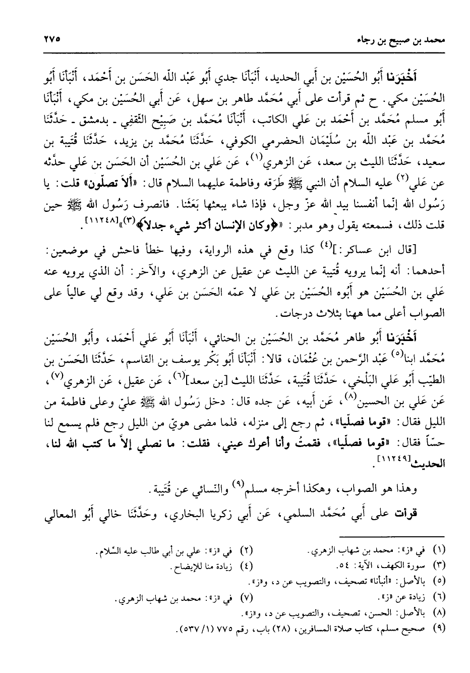 أخبرنا أبو الحسين بن أبي الحديد أنبأنا جدي أبو عبد الله الحسن بن أحمد أنبأنا أبو الحسن مكي ثم قرأت على أبي محمد طاهر بن سهل عن أبي الحسين بن مكي أنبأنا أبو مسلم محمد بن أحمد بن علي الكاتب أنبأنا محمد بن صبيح الثقفي بدمشق حدثنا محمد بن عبد الله بن سليمان الحضرمي الكوفي حدثنا محمد بن يزيد حدثنا قتيبة بن سعيد حدثنا الليث بن سعد عن الزهري (1) عن علي بن الحسين أن الحسن بن علي حدثه عن علي (2) عليه السلام أن النبي (صلى الله عليه وسلم) طرقه وفاطمة عليهما السلام قال ألا تصلون قلت يا رسول الله إنما أنفسنا بيد الله عز وجل فإذا شاء يبعثها بعثنا فانصرف رسول الله (صلى الله عليه وسلم) حين قلت ذلك فسمعته يقول وهو مدبر " وكان الإنسان أكثر شئ جدلا " (3) [11248) قال ابن عساكر (4) كذا وقع في هذه الرواية وفيها خطأ فاحش في موضعين أحدهما أنه إنما يرويه قتيبه عن الليث عن عقيل عن الزهري والآخر أن الذي يرويه عنه علي بن الحسين هو أبوه الحسين بن علي لا عمه الحسن بن علي وقد وقع لي عاليا على الصواب أعلى مما ههنا بثلاث درجات أخبرنا أبو طاهر محمد بن الحسين بن الحنائي أنبأنا أبو علي أحمد وأبو الحسين محمد ابنا (5) عبد الرحمن بن عثمان قالا أنبأنا أبو بكر يوسف بن القاسم حدثنا الحسن بن الطيب أبو علي البلخي حدثنا قتيبة حدثنا الليث بن سعد (6) عن عقيل عن الزهري (7) عن علي بن الحسين (8) عن أبيه عن جده قال دخل رسول الله (صلى الله عليه وسلم) علي وعلى فاطمة من الليل فقال قوما فصليا ثم رجع إلى منزله فلما مضى هوي من الليل رجع فلم يسمع لنا حسا فقال قوما فصليا فقمت وأنا أعرك عيني فقلت ما نصلي إلا ما كتب الله لنا الحديث الحديث