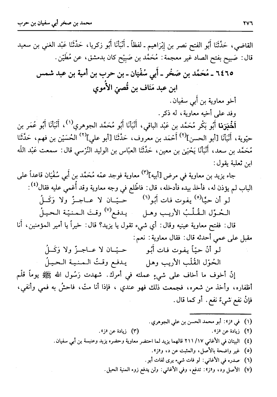 6465 - محمد بن صخر أبي سفيان بن حرب بن أمية بن عبد شمس ابن عبد مناف بن قصي الأموي أخو معاوية بن أبي سفيان وفد على أخيه معاوية له ذكر أخبرنا أبو بكر محمد بن عبد الباقي أنبأنا أبو محمد الجوهري (1) أنبأنا أبو عمر بن حيوية أنبأنا أبو الحسن (2) أحمد بن معروف حدثنا أبو علي (2) الحسين بن فهم حدثنا محمد بن سعد أنبأنا يحيى بن معين حدثنا العباس بن الوليد النرسي قال سمعت عبد الله ابن ثعلبة يقول جاء يزيد بن معاوية في مرض أبيه (3) معاوية فوجد عمه محمد بن أبي سفيان قاعدا على الباب لم يؤذن له فأخذ بيده فأدخله قال فاطلع في وجه معاوية وقد أغمى يعليه فقال (4) * لو أن حيا (5) يفوت فات أبو (6) * حيان لا عاجز ولا وكل الحول القلب الأريب وهل * يدفع (7) وقت المنية الحيل * قال ففتح معاوية عينيه وقال أي شئ تقول يا يزيد قال خيرا يا أمير المؤمنين أنا مقبل على عمي أحدثه قال فقال معاوية نعم * لو أن حيا يفوت فات أبو * حيان لا عاجز ولا وكل * * الحول القلب الأريب وهل * يدفع وقت المنية الحيل * إن أخوف ما أخاف على شئ عملته في أمرك شهدت رسول الله (صلى الله عليه وسلم) يوما قلم أظفاره وأخذ من شعره فجمعت ذلك فهو عندي فإذا أنا مت فاحش به فمي وأنفي فإن نفع شئ نفع أو كما قال