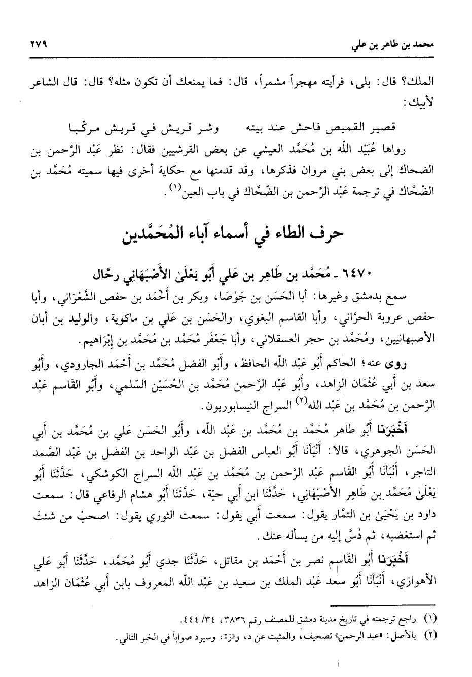 الملك قال بلى فرأيته مهجرا مشمرا قال فما يمنعك أن تكون مثله قال قال الشاعر لأبيك * قصير القميص فاحش عند بيته * وشر قريش في قريش مركبا * رواها عبيد الله بن محمد العيشي عن بعض القرشيين فقال نظر عبد الرحمن بن الضحاك إلى بعض بني مروان فذكرها وقد قدمتها مع حكاية أخرى فيها سميته محمد بن الضحاك في ترجمة عبد الرحمن بن الضحاك في باب العين (1) " حرف الطاء في أسماء آباء المحمدين "