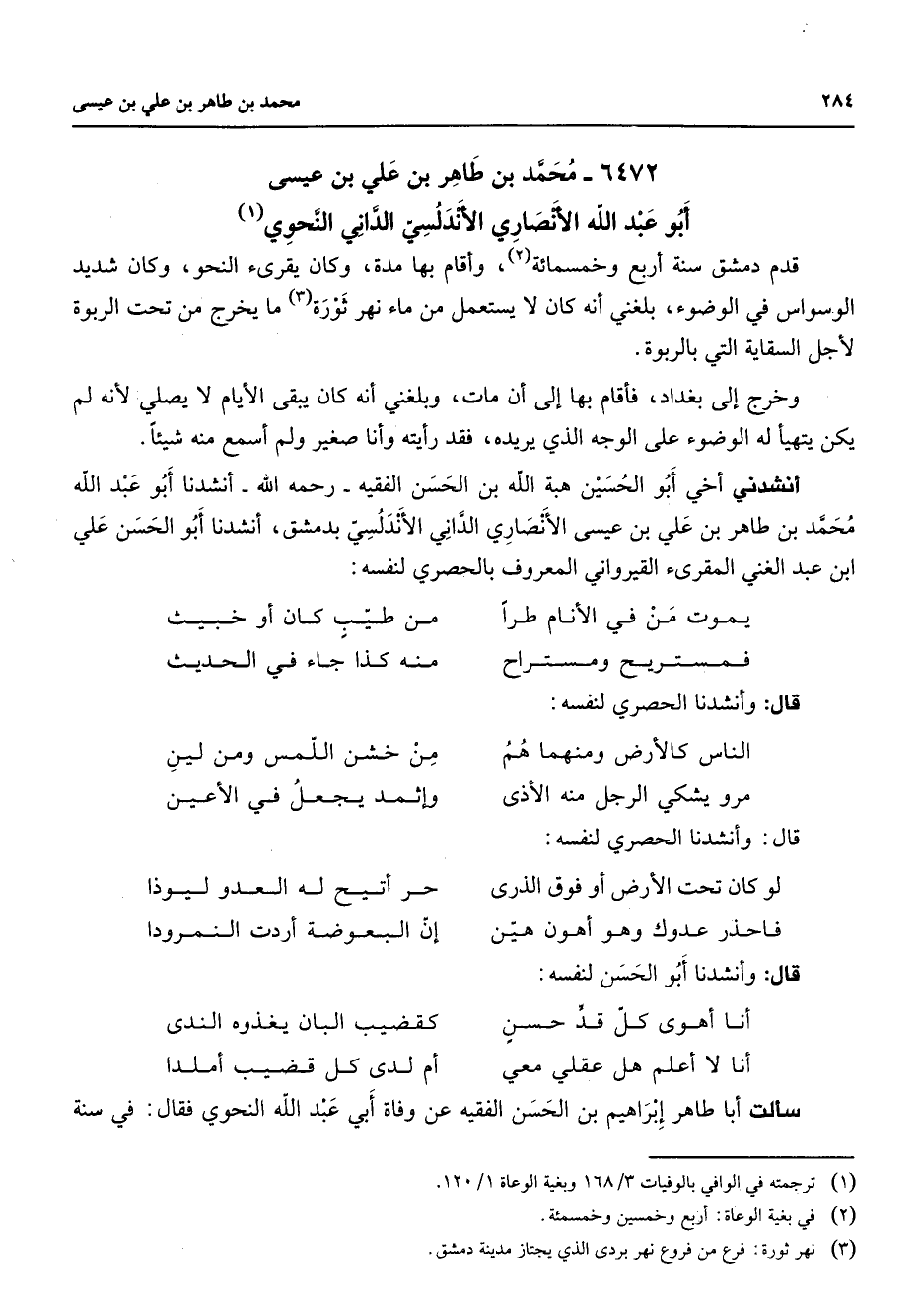 6472 - محمد بن طاهر بن علي بن عيسى أبو عبد الله الأنصاري الأندلسي الداني النحوي (1) قدم دمشق سنة أربع وخمسمائة (2) وأقام بها مدة وكان يقرئ النحو وكان شديد الوسواس في الوضوء بلغني أنه كان لا يستعمل من ماء نهر ثورة (3) مايخرج من تحت الربوة لأجل السقاية التي بالربوة وخرج إلى بغداد فأقام بها إلى أن مات وبلغني أنه كان يبقى الأيام لا يصلي لأنه لم يكن يتهيأ له الوضوء على الوجه الذي يريده فقد رأيته وأنا صغير ولم أسمع منه شيئا أنشدني أخي أبو الحسين هبة الله بن الحسن الفقيه رحمه الله أنشدنا أبو عبد الله محمد بن طاهر بن علي بن عيسى الأنصاري الداني الأندلسي بدمشق أنشدنا أبو الحسن علي ابن عبد الغني المقرئ القيرواني المعروف بالحصري لنفسه * يموت من في الأنام طرا * من طيب كان أو خبيث فمستريح ومستراح * منه كذا جاء في الحديث * قال وأنشدنا الحصري لنفسه * الناس كالأرض ومنهما هم * من خشن اللمس ومن لين مرو يشكي الرجل منه الأذى * وإثمد يجعل في الأعين * قال وأنشدنا الحصري لنفسه * لو كان تحت الأرض أو فوق الذرى * حر أتيح له العدو ليوذا فاحذر عدوك وهو أهون هين * إن البعوضة أردت النمرودا * قال وأنشدنا أبو الحسن لنفسه * أنا أهوى كل قد حسن * كقضيب البان يغدوه الندى أنا لا أعلم هل عقلي معي * أم لدى كل قضيب أملدا * سألت أبا طاهر إبراهيم بن الحسن الفقيه عن وفاة أبي عبد الله النحوي فقال في سنة