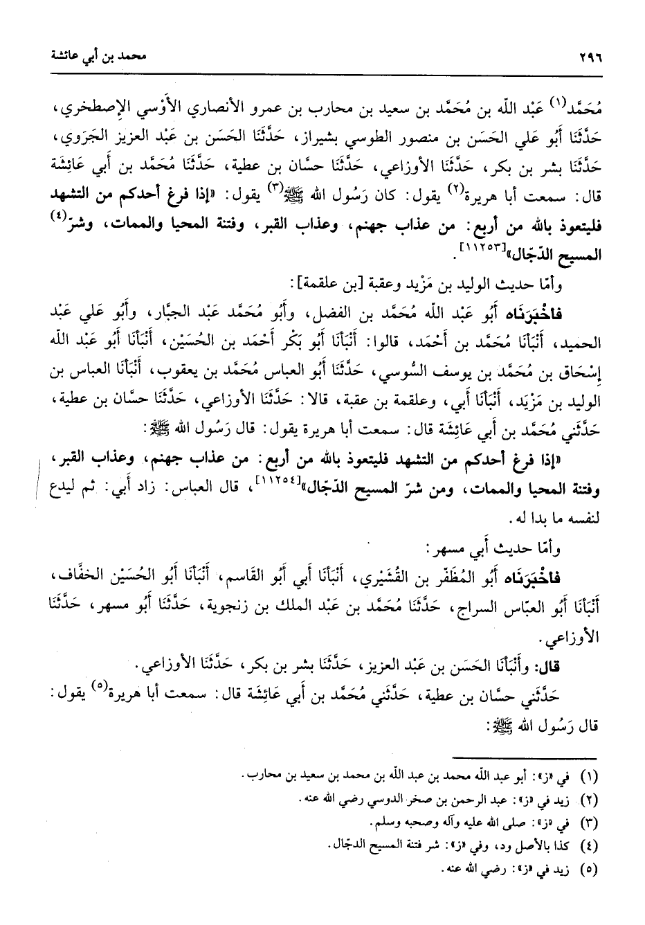محمد (1) عبد الله بن محمد بن سعيد بن محارب بن عمرو الأنصاري الأوسي الإصطخري حدثنا أبو علي الحسن بن منصور الطوسي بشيراز حدثنا الحسن بن عبد العزيز الجروي حدثنا بشر بن بكر حدثنا الأوزاعي حدثنا حسان بن عطية حدثنا محمد بن أبي عائشة قال سمعت أبا هريرة (2) يقول كان رسول الله (صلى الله عليه وسلم) (3) يقول إذا فرغ أحدكم من التشهد فليتعوذ بالله من أربع من عذاب جهنم وعذاب القبر وفتنة المحيا والممات وشر (4) المسيح الدجال