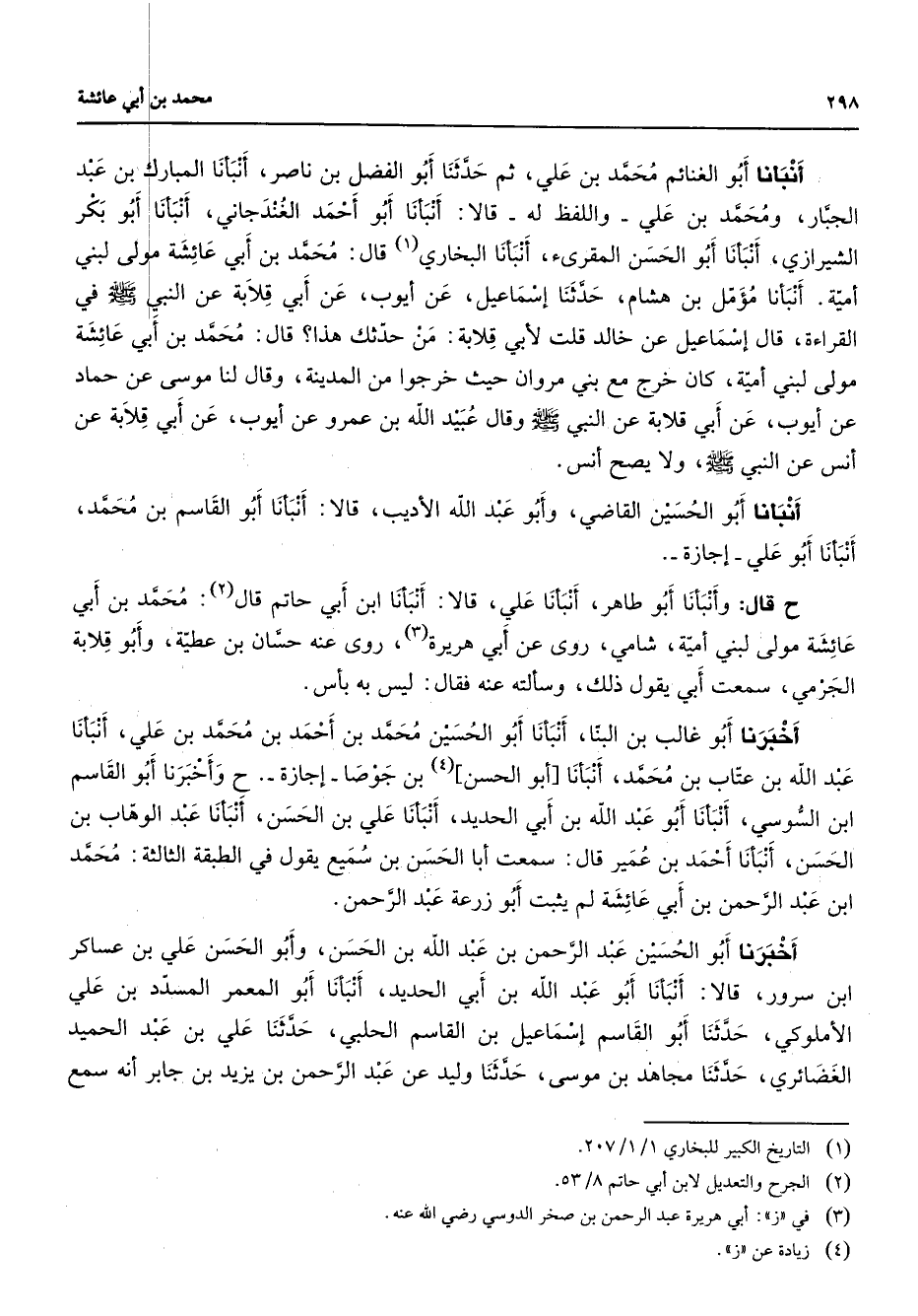 أنبأنا أبو الغنائم محمد بن علي ثم حدثنا أبو الفضل بن ناصر أنبأنا المبارك بن عبد الجبار ومحمد بن علي واللفظ له قالا أنبأنا أبو أحمد الغندجاني أنبأنا أبو بكر الشيرازي أنبأنا أبو الحسن المقرئ أنبأنا البخاري (1) قال محمد بن أبي عائشة مولى لبني أمية أنبأنا مؤمل بن هشام حدثنا إسماعيل عن أيوب عن أبي قلابة عن النبي (صلى الله عليه وسلم) في القراءة قال إسماعيل عن خالد قلت لأبي قلابة من حدثك هذا قال محمد بن أبي عائشة مولى لبني أمية كان خرج من بني مروان حيث خرجوا من المدينة وقال لنا موسى عن حماد عن أيوب عن أبي قلابة عن النبي (صلى الله عليه وسلم) وقال عبيد الله بن عمرو عن أيوب عن أبي قلابة عن أنس عن النبي (صلى الله عليه وسلم) ولا يصح أنس أنبأنا أبو الحسين القاضي وأبو عبد الله الأديب قالا أنبأنا أبو القاسم بن محمد أنبأنا أبو علي إجازة ح قال وأنبأنا أبو طاهر أنبأنا علي قالا أنبأنا ابن أبي حاتم قال (2) محمد بن أبي عائشة مولى لبني أمية شامي روى عن أبي هريرة (3) روى عنه حسان بن عطية وأبو قلابة الجرمي سعت أبي يقول ذلك وسألته عنه فقال ليس به بأس أخبرنا أبو غالب بن البنا أنبأنا أبو الحسين محمد بن أحمد بن محمد بن علي أنبأنا عبد الله بن عتاب بن محمد أنبأنا أبو الحسن (4) بن جوصا إجازة وأخبرنا أبو القاسم ابن السوسي أنبأنا أبو عبد الله بن أبي الحديد أنبأنا علي بن الحسن أنبأنا عبد الوهاب بن الحسن أنبأنا أحمد بن عمير قال سمعت أبا الحسن بن سميع يقول في الطبقة الثالثة محمد ابن عبد الرحمن بن أبي عائشة لم يثبت أبو زرعة عبد الرحمن أخبرنا أبو الحسين عبد الرحمن بن عبد الله بن الحسن وأبو الحسن علي بن عساكر ابن سرور قالا أنبأنا أبو عبد الله بن أبي الحديد أنبأنا أبو المعمر المسدد بن علي الأملوكي حدثنا أبو القاسم إسماعيل بن القاسم الحلبي حدثنا علي بن عبد الحميد الغضائري حدثنا مجاهد بن موسى حدثنا وليد عن عبد الرحمن بن يزيد بن جابر أنه سمع