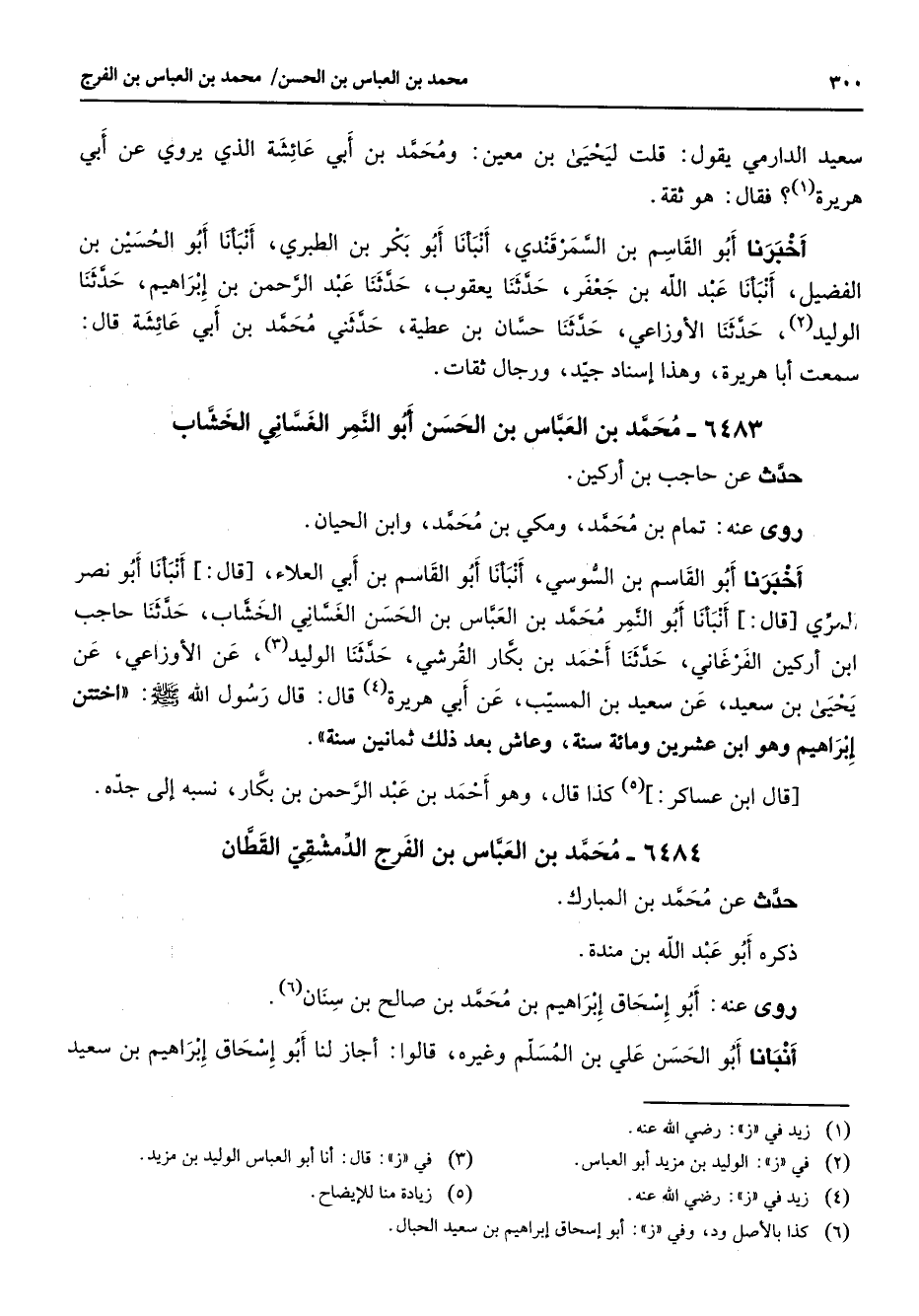 6483 - محمد بن العباس بن الحسن أبو النمر الغساني الخشاب حدث عن حاجب بن أركين روى عنه تمام بن محمد ومكي بن محمد وابن الحيان أخبرنا أبو القاسم بن السوسي أنبأنا أبو القاسم بن أبي العلاء قال أنبأنا أبو نصر المري قال أنبأنا أبو النمر محمد بن العباس بن الحسن الغساني الخشاب حدثنا حاجب ابن أركين الفرغاني حدثنا أحمد بن بكار القرشي حدثنا الوليد (3) عن الأوزاعي عن يحيى بن سعيد عن سعيد بن المسيب عن أبي هريرة (4) قال قال رسول الله (صلى الله عليه وسلم) اختتن إبراهيم وهو ابن عشرين ومائة سنة وعاش بعد ذلك ثمانين سنة قال ابن عساكر (5) كذا قال وهو أحمد بن عبد الرحمن بن بكار نسبه إلى جده