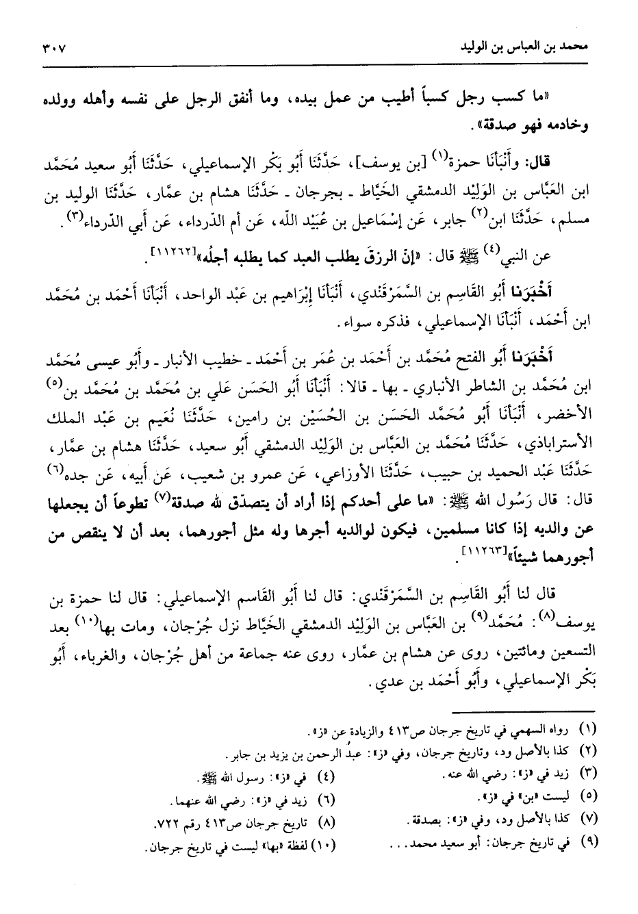 [11263] قال لنا أبو القاسم بن السمرقندي قال لنا أبو القاسم الإسماعيلي قال لنا حمزة بن يوسف (8) محمد (9) بن العباس بن الوليد الدمشقي الخياط نزل جرجان ومات بها (10) بعد التسعين ومائتين روى عن هشام بن عمار روى عنه جماعة من أهل جرجان والغرباء أبو بكر الإسماعيلي وأبو أحمد بن عدي