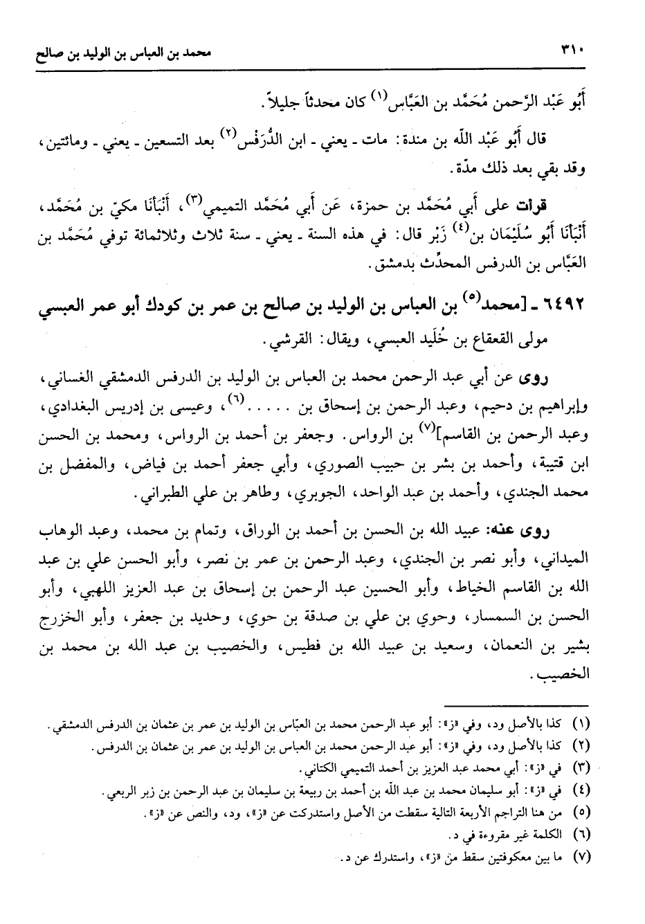 أبو عبد الرحمن محمد بن العباس (1) كان محدثا جليلا قال أبو عبد الله بن مندة مات يعني ابن الدرفس (2) بعد التسعين يعني ومائتين وقد بقي بعد ذلك مدة قرأت على أبي محمد بن حمزة عن أبي محمد التميمي (3) أنبأنا مكي بن محمد أنبأنا أبو سليمان بن (4) زبر قال في هذه السنة يعني سنة ثلاث وثلاثمائة توفي محمد بن العباس بن الدرفس المحدث بدمشق