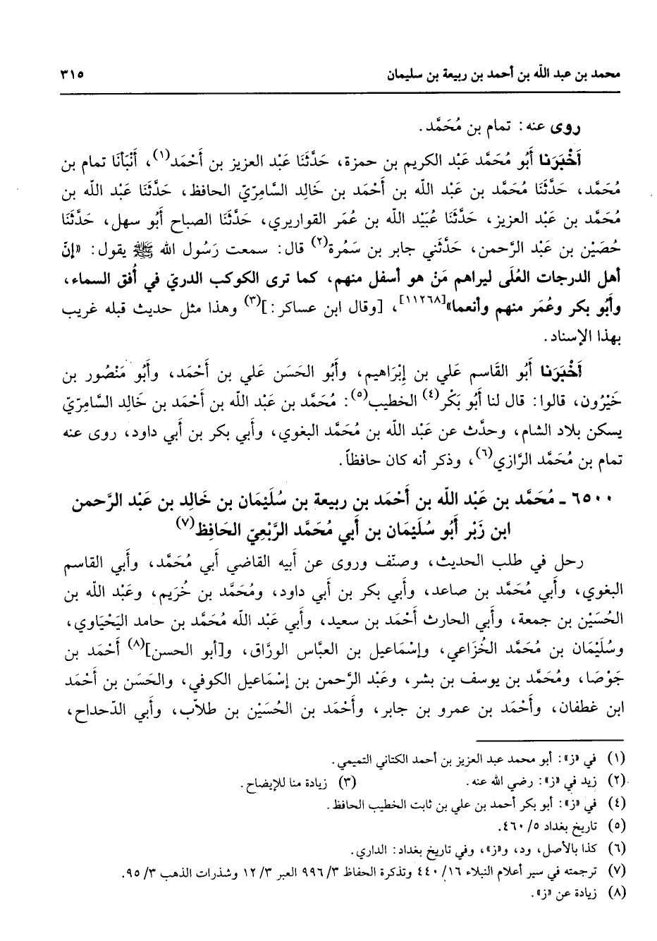 6500 - محمد بن عبد الله بن أحمد بن ربيعة بن سليمان بن خالد بن عبد الرحمن ابن زبر أبو سليمان بن أبي محمد الربعي الحافظ (7) رحل في طلب الحديث وصنف وروى عن أبيه القاضي أبي محمد وأبي القاسم البغوي وأبي محمد بن صاعد وأبي بكر بن أبي داود ومحمد بن خريم وعبد الله بن الحسين بن جمعة وأبي الحارث أحمد بن سعيد وأبي عبد الله محمد بن حامد اليحياوي وسليمان بن محمد الخزاعي وإسماعيل بن العباس الوراق وأبو الحسن (8) أحمد بن جوصا د جوصا ومحمد بن يوسف بن بشر وعبد الرحمن بن إسماعيل الكوفي والحسن بن أحمد ابن غطفان وأحمد بن عمرو بن جابر وأحمد بن الحسين بن طلاب وأبي الدحداح