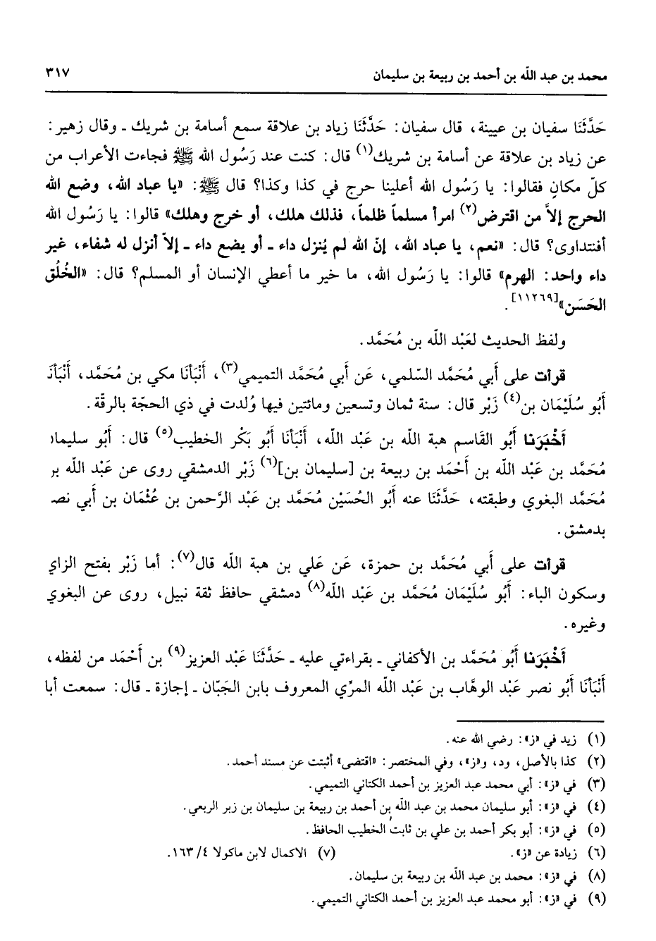 [11269] ولفظ الحديث لعبد الله بن محمد قرأت على أبي محمد السلمي عن أبي محمد التميمي (3) أنبأنا مكي بن محمد أنبأنا أبو سليمان بن (4) زبر قال سنة ثمان وتسعين ومائتين فيها ولدت في ذي الحجة بالرقة أخبرنا أبو القاسم هبة الله بن عبد الله أنبأنا أبو بكر الخطيب (5) قال أبو سليمان محمد بن عبد الله بن أحمد بن ربيعة بن سليمان بن (6) زبر الدمشقي روى عن عبد الله بن محمد البغوي وطبقته حدثنا عنه أبو الحسين محمد بن عبد الرحمن بن عثمان بن أبي نصر بدمشق قرأت على أبي محمد بن حمزة عن علي بن هبة الله قال (7) أما زبر بفتح الزاي وسكون الباء أبو سليمان محمد بن عبد الله (8) دمشقي حافظ ثقة نبيل روى عن البغوي وغيره أخبرنا أبو محمد بن الأكفاني بقراءتي عليه حدثنا عبد العزيز (9) بن أحمد من لفظه أنبأنا أبو نصر عبد الوهاب بن عبد الله المري المعروف بابن الجبان إجازة قال سمعت أبا