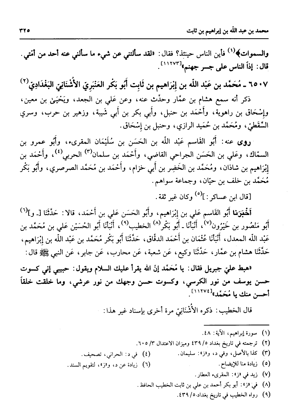6507 - محمد بن عبد الله بن إبراهيم بن ثابت أبو بكر العنبري الأشناني البغدادي (2) ذكر أنه سمع هشام بن عمار وحدث عنه وعن علي بن الجعد ويحيى بن معين وإسحاق بن راهوية وأحمد بن حنبل وأبي بكر بن أبي شيبة وزهير بن حرب وسري السقطي ومحمد بن حميد الرازي وحنبل بن إسحاق روى عنه أبو القاسم عبد الله بن الحسن بن سليمان المقرئ وأبو عمرو بن السماك وعلي بن الحسن الجراحي القاضي وأحمد بن سلمان (3) الحربي (4) وأحمد بن إبراهيم بن شاذان ومحمد بن الخضر بن أبي خزام وأحمد بن محمد الصرصري وأبو بكر محمد بن خلف بن حيان وجماعة سواهم قال ابن عساكر (5) وكان غير ثقة أخبرنا أبو القاسم علي بن إبراهيم وأبو الحسن علي بن أحمد قالا حدثنا و (6) أبو منصور بن خيرون (7) أنبأنا أبو بكر (8) الخطيب (9) أنبأنا أبو الحسين علي بن محمد بن عبد الله المعدل أنبأنا عثمان بن أحمد الدقاق حدثنا أبو بكر محمد بن عبد الله بن إبراهيم حدثنا هشام بن عمار حدثنا وكيع عن شعبة عن محارب عن جابر عن النبي (صلى الله عليه وسلم) قال هبط علي جبريل فقال يا محمد إن الله يقرأ عليك السلام ويقول حبيبي إني كسوت حسن يوسف من نور الكرسي وكسوت حسن وجهك من نور عرشي وما خلقت خلقا أحسن منك يا محمد