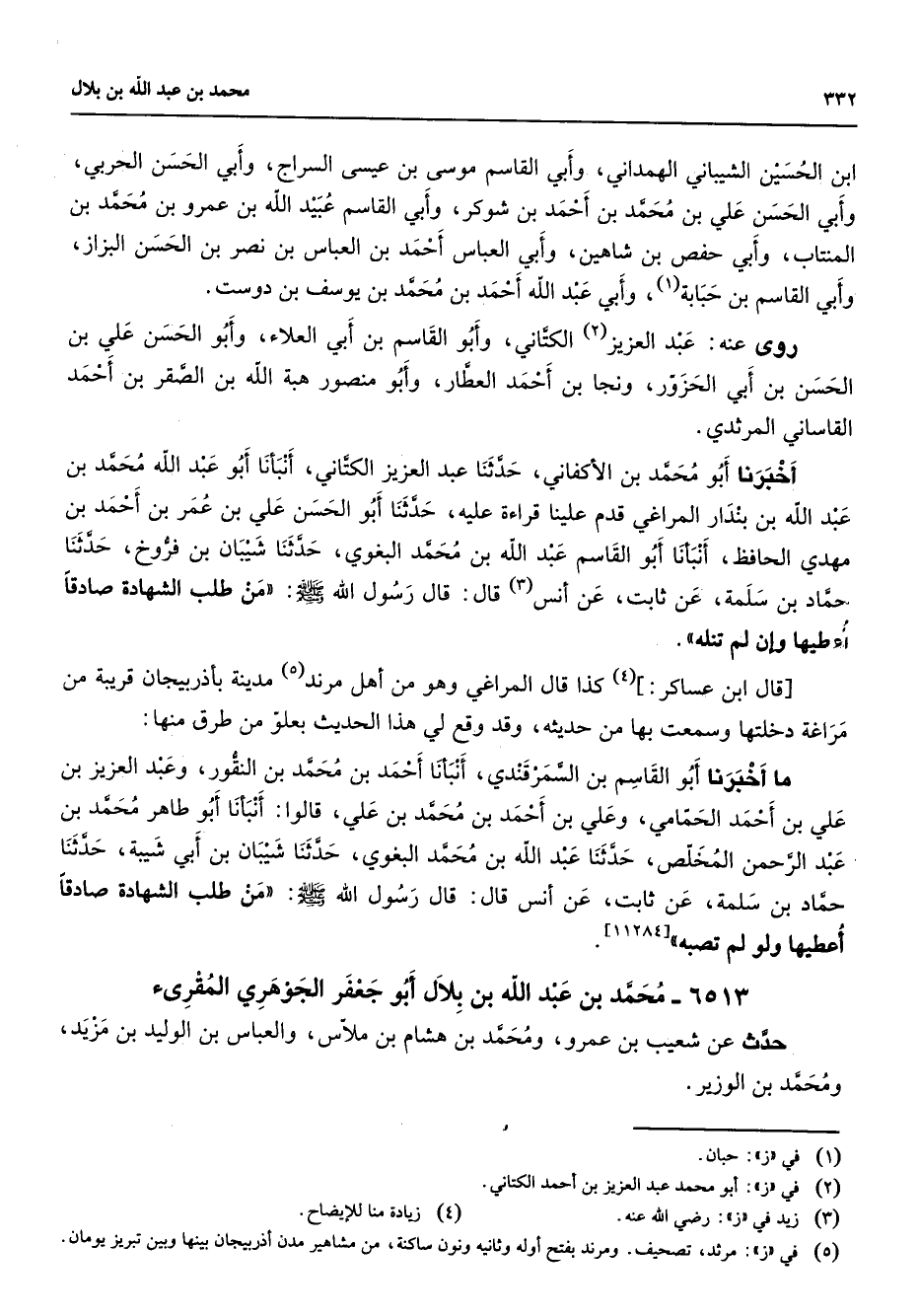 ابن الحسين الشيباني الهمداني وأبي القاسم موسى بن عيسى السراج وأبي الحسن الحربي وأبي الحسن علي بن محمد بن أحمد بن شوكر وأبي القاسم عبيد الله بن عمرو بن محمد بن المنتاب وأبي حفص بن شاهين وأبي العباس أحمد بن العباس بن نصر بن الحسن البزاز وأبي القاسم بن حبابة (1) وأبي عبد الله أحمد بن محمد بن يوسف بن دوست روى عنه عبد العزيز (2) الكتاني وأبو القاسم بن أبي العلاء وأبو الحسن علي بن الحسن بن أبي الحزور ونجا بن أحمد العطار وأبو منصور هبة الله بن الصقر بن أحمد القاساني المرثدي أخبرنا أبو محمد بن الأكفاني حدثنا عبد العزيز الكتاني أنبأنا أبو عبد الله محمد بن عبد الله بن بندار المراغي قدم علينا قراءة عليه حدثنا أبو الحسن علي بن عمر بن أحمد بن مهدي الحافظ أنبأنا أبو القاسم عبد الله بن محمد البغوي حدثنا شيبان بن فروخ حدثنا حماد بن سلمة عن ثابت عن أنس (3) قال قال رسول الله (صلى الله عليه وسلم) من طلب الشهادة صادقا أعطيها وإن لم تنله قال ابن عساكر (4) كذا قال المراغي وهو من أهل مرند (5) مدينة بأذربيجان قريبة من مراغة دخلتها وسمعت بها من حديثه وقد وقع لي هذا الحديث بعلو من طرق منها ما أخبرنا أبو القاسم بن السمرقندي أنبانا أحمد بن محمد بن النقور وعبد العزيز بن علي بن أحمد الحمامي وعلي بن أحمد بن محمد بن علي قالوا أنبأنا أبو طاهر محمد بن عبد الرحمن المخلص حدثنا عبد الله بن محمد البغوي حدثنا شيبان بن أبي شيبة حدثنا حماد بن سلمة عن ثابت عن أنس قال قال رسول الله (صلى الله عليه وسلم) من طلب الشهادة صادقا أعطيها ولم لم تصبه ج (11284) 6513 محمد بن عبد الله بن بلال أبو جعفر الجوهري المقرئ حدث عن شعيب بن عمرو ومحمد بن هشام بن ملاس والعباس بن الوليد بن مزيد ومحمد بن الوزير