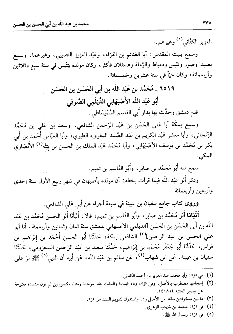 6519 - محمد بن عبد الله بن أبي الحسن بن الحسن أبو عبد الله الأصبهاني الديلمي الصوفي قدم دمشق وحدث بها بدار أبي القاسم السميساطي وسمع بمكة أبا علي الحسن بن عبد الرحمن الشافعي وسعد بن علي بن محمد الزنجاني وأبا معشر عبد الكريم بن عبد الصمد المقرئ الطبري وأبا العباس أحمد بن أبي بكر بن محمد بن يوسف الأصبهاني وأبا محمد عبد الملك بن الحسن بن بتنه (2) الأنصاري المكي سمع منه أبو محمد بن صابر وأبو القاسم بن تميم وذكر أبو عبد الله فيما قرأت بخطه أن مولده بأصبهان في شهر ربيع الأول سنة إحدى وأربعين وأربعمائة وروى كتاب جامع سفيان بن عيينة في سبعة أجزاء عن أبي علي الشافعي أنبأنا أبو محمد بن صابر وأبو القاسم بن تميم قالا أنبأنا أبو الحسن محمد بن عبد الله بن أبي الحسن بن الحسن الديلمي الأصبهاني بدمشق سنة ثمان وثمانين وأربعمئة أنا أبو علي الحسن بن عبد الرحمن (3) الشافعي بمكة حدثنا أبو الحسن أحمد بن إبراهيم بن فراس حدثنا أبو جعفر محمد بن إبراهيم حدثنا سعيد بن عبد الرحمن المخزومي حدثنا سفيان بن عيينة عن ابن شهاب (4) عن سالم بن عبد الله عن أبيه أن النبي (5) (صلى الله عليه وسلم) مر على