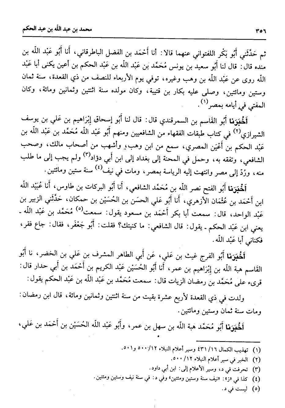 ثم حدثني أبو بكر اللفتواني عنهما قالا أنا أحمد بن الفضل الباطرقاني أنا أبو عبد الله بن منده قال قال لنا أبو سعيد بن يونس محمد بن عبد الله بن عبد الحكم بن أعين يكنى أبا عبد الله روى عن عبد الله بن وهب وغيره توفي يوم الأربعاء للنصف من ذي القعدة سنة ثمان وستين ومائتين وصلى عليه بكار بن قتيبة وكان مولده سنة اثنتين وثمانين ومائة وكان المفتي في أيامه بمصر (1) أخبرنا أبو القاسم بن السمرقندي قال قال لنا أبو إسحاق إبراهيم بن علي بن يوسف الشيرازي في كتاب طبقات الفقهاء من الشافعيين ومنهم أبو عبد الله محمد بن عبد الله بن عبد الحكم بن أعين المصري سمع من ابن وهب وأشهب من أصحاب مالك وصحب الشافعي وتفقه به وحمل في المحنة إلى بغداد إلى ابن أبي دؤاد (3) ولم يجب إلى ما طلب منه ورد إلى مصر وانتهت إليه الرياسة بمصر ومات في نيف (4) سنة ستين ومائتين أخبرنا أبو الفتح نصر الله بن محمد الشافعي أنا أبو البركات بن طاوس أنا عبيد الله ابن أحمد بن عثمان الأزهري أنا أبو علي الحسن بن الحسين بن حمكان حدثني الزبير بن عبد الواحد قال سمعت أبا بكر أحمد بن مسعود يقول سمعت (5) محمد بن عبد الله يعني ابن عبد الحكم يقول قال الشافعي ما كنيتك فقلت أبو جعفر فقال جاع فقر فكناني أبا عبد الله أخبرنا أبو الفرج غيث بن علي عن أبي الطاهر المشرف بن علي بن الخضر نا أبو القاسم هبة الله بن إبراهيم بن عمر أنا أبو الحسين عبد الكريم بن أحمد بن أبي حدار قال قرئ على محمد بن رمضان الزيات قال سمعت محمد بن عبد الله بن عبد الحكم يقول ولدت في ذي القعدة لأربع عشرة بقيت من سنة اثنتين وثمانين ومائة قال ابن رمضان ومات سنة ثمان وستين ومائتين أخبرنا أبو محمد هبة الله بن سهل بن عمر وأبو عبد الله الحسين بن أحمد بن علي