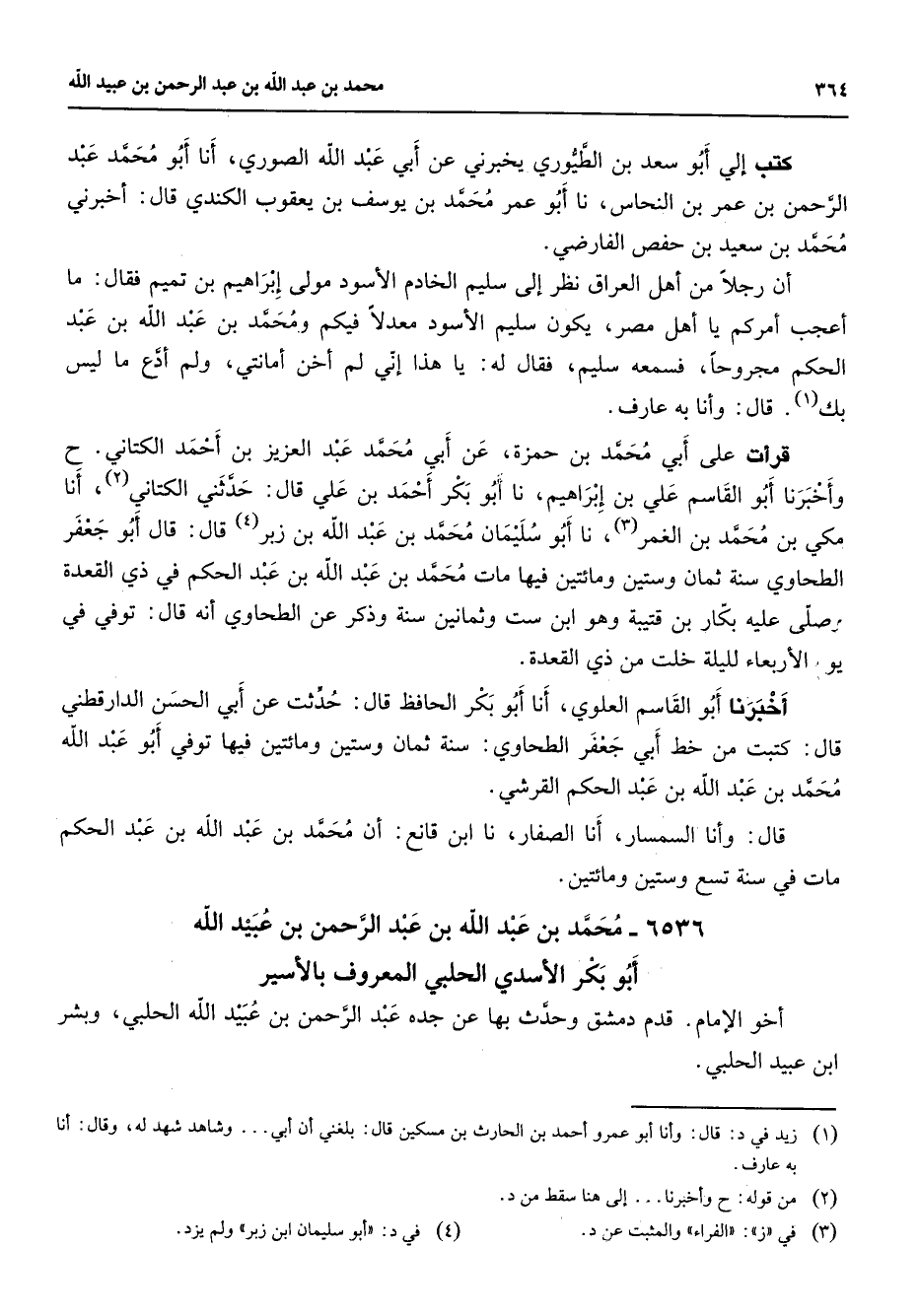 6536 - محمد بن عبد الله بن عبد الرحمن بن عبيد الله أبو بكر الأسدي الحلبي المعروف بالأسير أخو الإمام قدم دمشق وحدث بها عن جده عبد الرحمن بن عبيد الله الحلبي وبشر ابن عبيد الحلبي