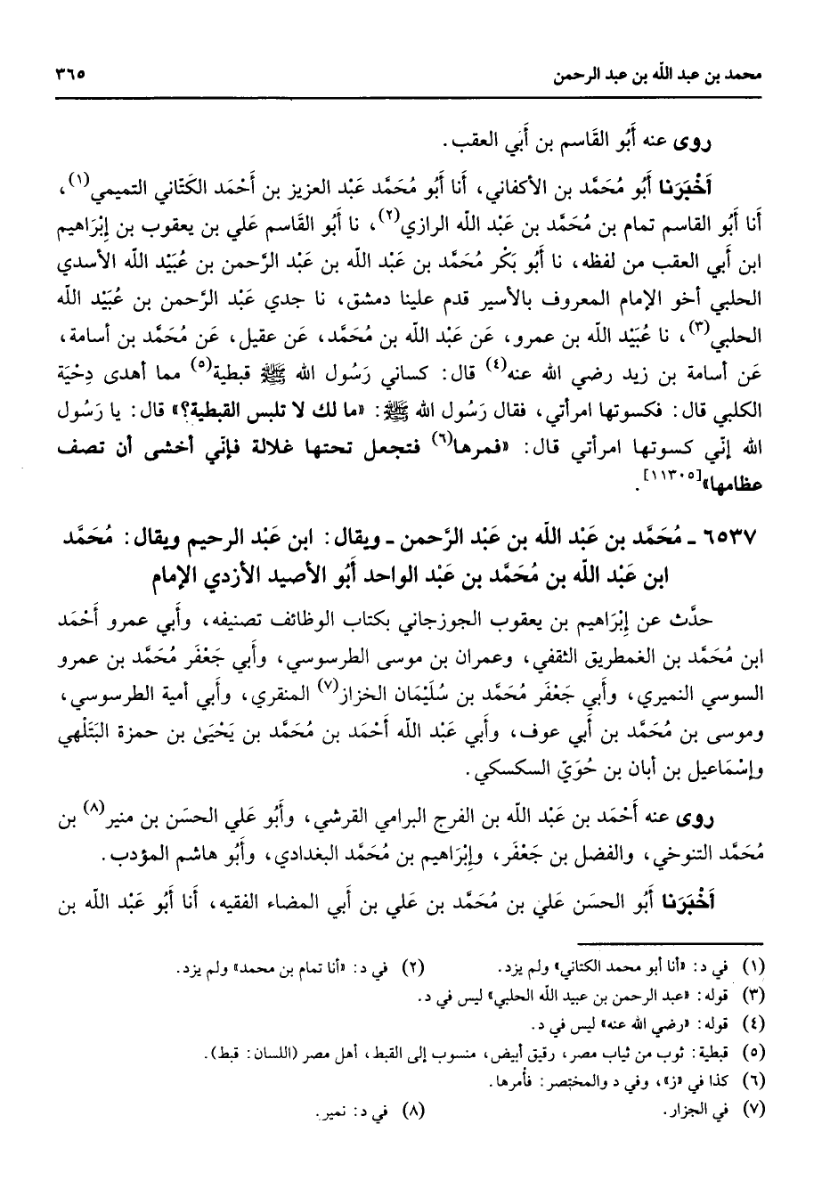 روى عنه أبو القاسم بن أبي العقب أخبرنا أبو محمد بن الأكفاني أنا أبو محمد عبد العزيز بن أحمد الكتاني التميمي (1) أنا أبو القاسم تمام بن محمد بن عبد الله الرازي (2) نا أبو القاسم علي بن يعقوب بن إبراهيم ابن أبي العقب من لفظه نا أبو بكر محمد بن عبد الله بن عبد الرحمن بن عبيد الله الأسدي الحلبي أخو الإمام المعروف بالأسير قدم علينا دمشق نا جدي عبد الرحمن بن عبيد الله الحلبي نا عبيد الله بن عمرو عن عبد الله بن محمد عن عقيل عن محمد بن أسامة عن أسامة بن زيد Bهـ (4) قال كساني رسول الله (صلى الله عليه وسلم) قبطية (5) مما أهدى دحية الكلبي قال فكسوتها امرأتي فقال رسول الله (صلى الله عليه وسلم) ما لك لا تلبس القبطية قال يا رسول الله إني كسوتها امرأتي قال فمرها (6) فتجعل تحتها غلالة فإني أخشى أن تصف عظامهاح (11305)