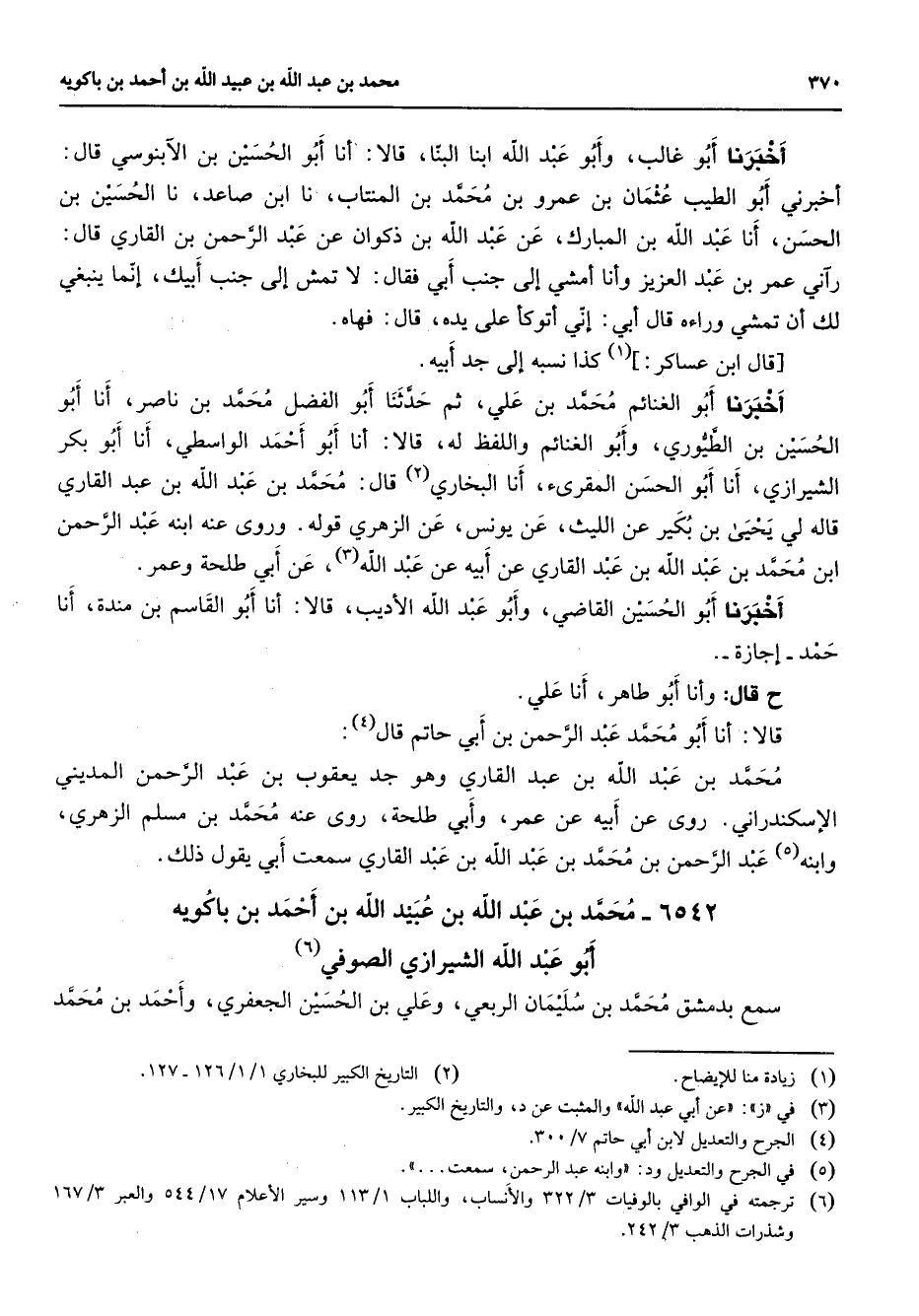 6542 - محمد بن عبد الله بن عبيد الله بن أحمد بن باكويه أبو عبد الله الشيرازي الصوفي (6) سمع بدمشق محمد بن سليمان الربعي وعلي بن الحسين الجعفري وأحمد بن محمد