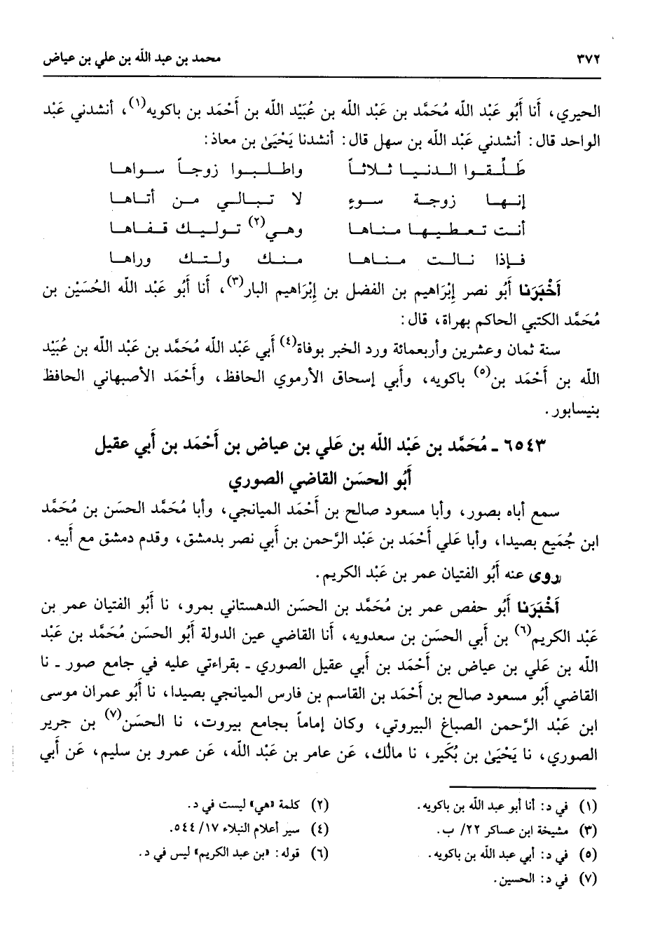 الحيري أنا أبو عبد الله محمد بن عبد الله بن عبيد الله بن أحمد بن باكويه (1) أنشدني عبد الواحد قال أنشدني عبد الله بن سهل قال أنشدنا يحيى بن معاذ * طلقوا الدنيا ثلاثا * واطلبوا زوجا سواها إنها زوجة سوء * لا تبالي من أتاها أنت تعطيها مناها * وهي (2) توليك قفاها فإذا نالت مناها * منك ولتك وراها * أخبرنا أبو نصر إبراهيم بن الفضل بن إبراهيم البار (3) أنا أبو عبد الله الحسين بن محمد الكتبي الحاكم بهراة قال سنة ثمان وعشرين وأربعمائة ورد الخبر بوفاة (4) أبي عبد الله محمد بن عبد الله بن عبيد الله بن أحمد بن (5) باكويه وأبي إسحاق الأرموي الحافظ وأحمد الأصبهاني الحافظ بنيسابور