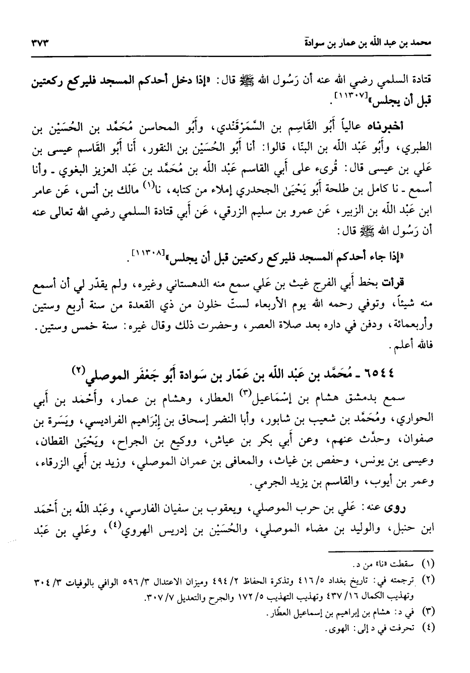 6544 - محمد بن عبد الله بن عمار بن سوادة أبو جعفر الموصلي (2) سمع بدمشق هشام بن إسماعيل (3) العطار وهشام بن عمار وأحمد بن أبي الحواري ومحمد بن شعيب بن شابور وأبا النضر إسحاق بن إبراهيم الفراديسي ويسرة بن صفوان وحدث عنهم وعن أبي بكر بن عياش ووكيع بن الجراح ويحيى القطان وعيسى بن يونس وحفص بن غياث والمعافى بن عمران الموصلي وزيد بن أبي الزرقاء وعمر بن أيوب والقاسم بن يزيد الجرمي روى عنه علي بن حرب الموصلي ويعقوب بن سفيان الفارسي وعبد الله بن أحمد ابن حنبل والوليد بن مضاء الموصلي والحسين بن إدريس الهروي (4) وعلي بن عبد