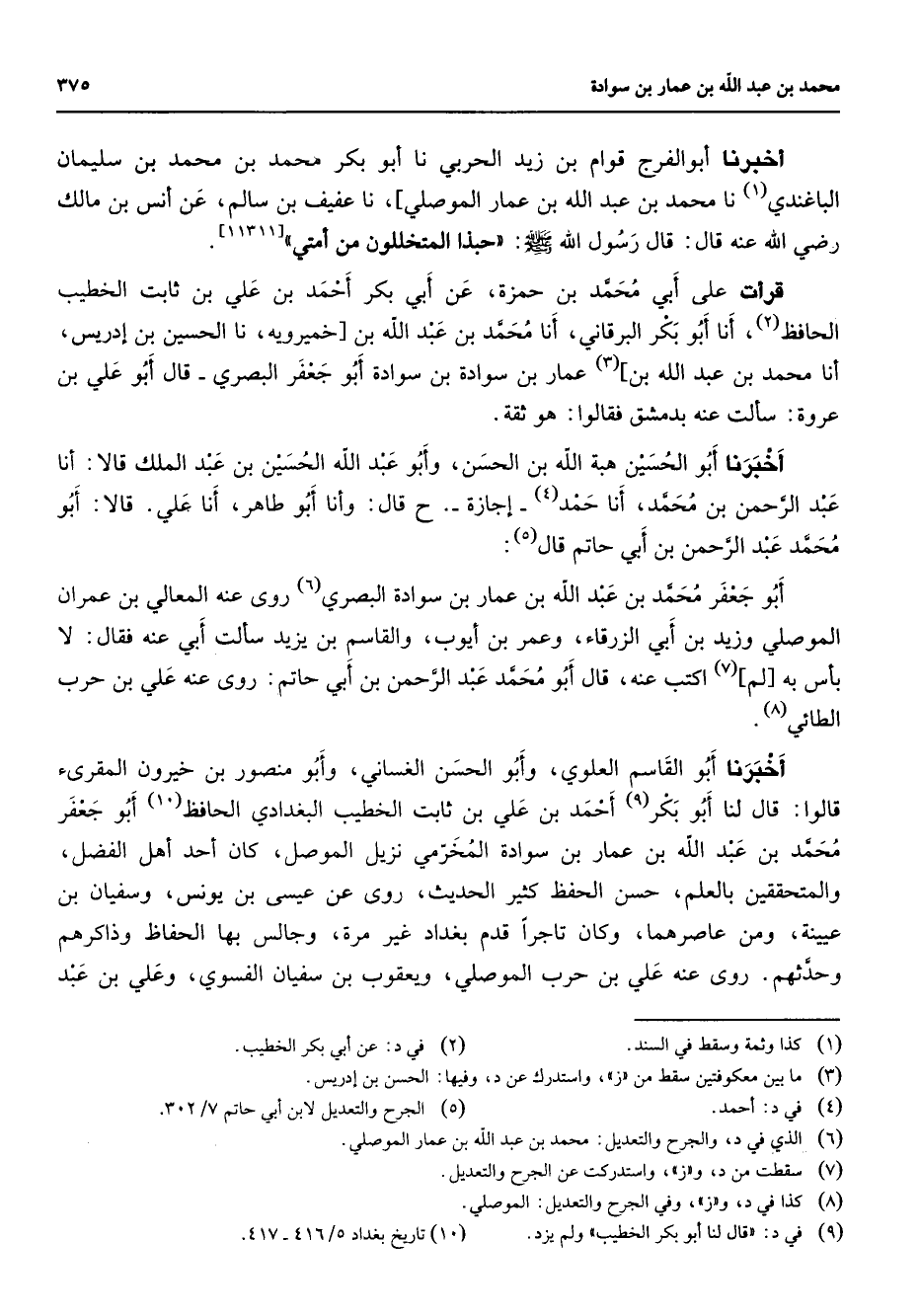 [11311] قرأت على أبي محمد بن حمزة عن أبي بكر أحمد بن علي بن ثابت الخطيب الحافظ (2) أنا أبو بكر البرقاني أنا محمد بن عبد الله بن خميرويه نا الحسين بن إدريس أنا محمد بن عبد الله بن (3) عمار بن سوادة بن سوادة أبو جعفر البصري قال أبو علي بن عروة سألت عنه بدمشق فقالوا هو ثقة أخبرنا أبو الحسين هبة الله بن الحسن وأبو عبد الله الحسين بن عبد الملك قالا أنا عبد الرحمن بن محمد أنا حمد (4) إجازة قال وأنا أبو طاهر أنا علي قالا أبو محمد عبد الرحمن بن أبي حاتم قال (5) أبو جعفر محمد بن عبد الله بن عمار بن سوادة البصري (6) روى عنه المعالي بن عمران الموصلي وزيد بن أبي الزرقاء وعمر بن أيوب والقاسم بن يزيد سألت أبي عنه فقال لا بأس به لم (7) اكتب عنه قال أبو محمد عبد الرحمن بن أبي حاتم روى عنه علي بن حرب الطائي (8) أخبرنا أبو القاسم العلوي وأبو الحسن الغساني وأبو منصور بن خيرون المقرئ قالوا قال لنا أبو بكر (9) أحمد بن علي بن ثابت الخطيب البغدادي الحافظ (10) أبو جعفر محمد بن عبد الله بن عمار بن سوادة المخرمي نزيل الموصل كان أحد أهل الفضل والمتحققين بالعلم حسن الحفظ كثير الحديث روى عن عيسى بن يونس وسفيان بن عيينة ومن عاصرهما وكان تاجرا قدم بغداد غير مرة وجالس بها الحفاظ وذاكرهم وحدثهم روى عنه علي بن حرب الموصلي ويعقوب بن سفيان الفسوي وعلي بن عبد