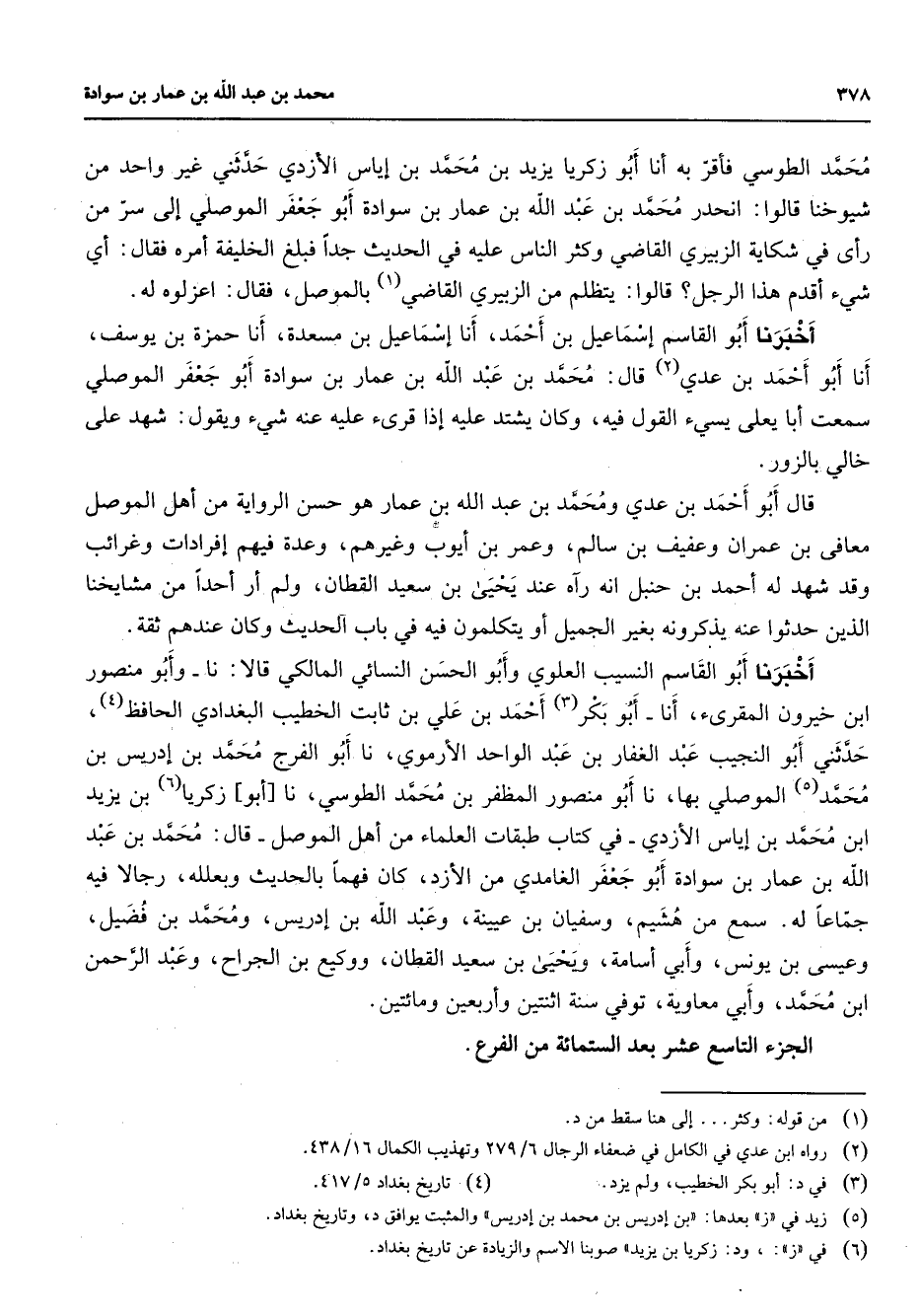 محمد الطوسي فأقر به أنا أبو زكريا يزيد بن محمد بن إياس الأزدي حدثني غير واحد من شيوخنا قالوا انحدر محمد بن عبد الله بن عمار بن سوادة أبو جعفر الموصلي إلى سر من رأى في شكاية الزبيري القاضي وكثير الناس عليه في الحديث جدا فبلغ الخليفة أمره فقال أي شئ أقدم هذا الرجل قالوا يتظلم من الزبيري القاضي (1) بالموصل فقال اعزلوه له أخبرنا أبو القاسم إسماعيل بن أحمد أنا إسماعيل بن مسعدة أنا حمزة بن يوسف أنا أبو أحمد بن عدي (2) قال محمد بن عبد الله بن عمار بن سوادة أبو جعفر الموصلي سمعت أبا يعلى يسئ القول فيه وكان يشتد عليه إذا قرئ عليه عنه شئ ويقول شهد على خالي بالزور قال وخالي بالزور قال أبو أحمد بن عدي ومحمد بن عبد الله بن عمار هو حسن الرواية من أهل الموصل معافى بن عمران وعفيف بن سالم وعمر بن أيوب وغيرهم وعدة فيهم إفرادات وغرائب وقد شهد له أحمد بن حنبل انه رآه عند يحيى بن سعيد القطان ولم أر أحدا من مشايخنا الذين حدثوا عنه يذكرونه بغير الجميل أو يتكلمون فيه في باب الحديث وكان عندهم ثقة أخبرنا أبو القاسم النسيب العلوي وأبو الحسن النسائي المالكي قالا نا وأبو منصور ابن خيرون المقرئ أنا أبو بكر (3) أحمد بن علي بن ثابت الخطيب البغدادي الحافظ (4) حدثني أبو النجيب عبد الغفار بن عبد الواحد الأرموي نا أبو الفرج محمد بن إدريس بن محمد الموصلي بها نا أبو منصور المظفر بن محمد الطوسي نا أبو زكريا (6) بن يزيد ابن محمد بن إياس الأزدي في كتاب طبقات العلماء من أهل الموصل قال محمد بن عبد الله بن عمار بن سوادة أبو جعفر الغامدي من الأزد كان فهما بالحديث وبعلله رجالا فيه جماعا له سمع من هشيم وسفيان بن عيينة وعبد الله بن إدريس ومحمد بن فضيل وعيسى بن يونس وأبي أسامة ويحيى بن سعيد القطان ووكيع بن الجراح وعبد الرحمن ابن محمد وأبي معاوية توفي سنة اثنتين وأربعين ومائتين الجز التاسع عشر بعد الستمائة من الفرع