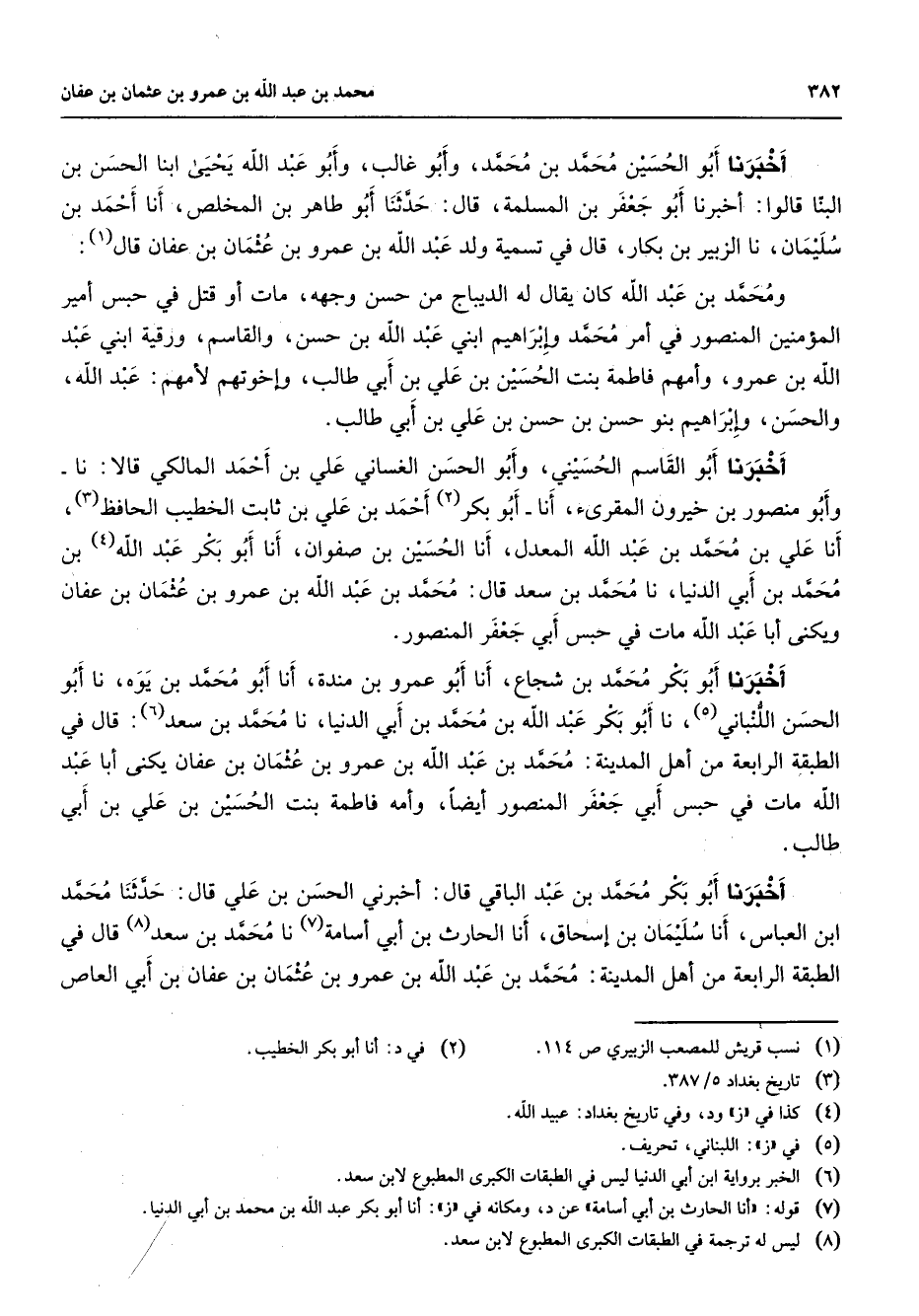 أخبرنا أبو الحسين محمد بن محمد وأبو غالب وأبو عبد اله يحيى ابنا الحسن بن البنا قالوا أخبرنا أبو جعفر بن المسلمة قال حدثنا أبو طاهر بن المخلص أنا أحمد بن سليمان نا الزبير بن بكار قال في تسمية ولد عبد الله بن عمرو بن عثمان بن عفان قال (1) ومحمد بن عبد الله كان يقال له الديباج من حسن وجهه مات أو قتل في حبس أمير المؤمنين المنصور في أمر محمد وإبراهيم ابني عبد الله بن حسن والقاسم ورقية ابني عبد الله بن عمرو وأمهم فاطمة بنت الحسين بن علي بن أبي طالب وإخوتهم لأمهم عبد الله والحسن وإبراهيم بنو حسن بن حسن بن علي بن أبي طالب أخبرنا أبو القاسم الحسيني وأبو الحسن الغساني علي بن أحمد المالكي قالا نا وأبو منصور بن خيرون المقرئ أنا أبو بكر أحمد بن علي بن ثابت الخطيب الحافظ (3) أنا علي بن د أنا علي بن محمد بن عبد الله المعدل أنا الحسين بن صفوان أنا أبو بكر عبد الله (4) بن محمد بن أبي الدنيا نا محمد بن سعد قال محمد بن عبد الله بن عمرو بن عثمان بن عفان ويكنى أبا عبد الله مات في حبس أبي جعفر المنصور أخبرنا أبو بكر محمد بن شجاع أنا أبو عمرو بن مندة أنا أبو محمد بن يوه نا أبو الحسن اللنباني نا أبو بكر عبد الله بن محمد بن أبي الدنيا نا محمد بن سعد (6) قال في الطبقة الرابعة من أهل المدينة محمد بن عبد الله بن عمرو بن عثمان بن عفان يكنى أبا عبد الله مات في حبس أبي جعفر المنصور أيضا وأمه فاطمة بنت الحسين بن علي بن أبي طالب أخبرنا أبو بكر محمد بن عبد الباقي قال أخبرني الحسن بن علي قال حدثنا محمد ابن العباس أنا سليمان بن إسحاق أنا الحارث بن أبي أسامة (7) نا محمد بن سعد (8) قال في الطبقة الرابعة من أهل المدينة محمد بن عبد الله بن عمرو بن عثمان بن عفان بن أبي العاص