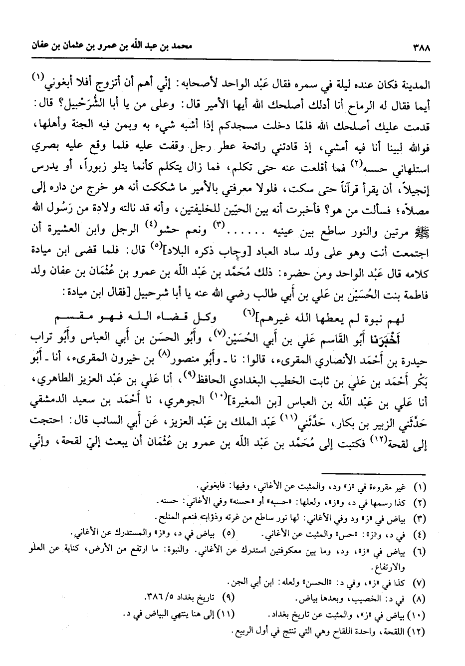 المدينة فكان عنده ليلة في سمره فقال عبد الواحد لأصحابه إني أهم أن أتزوج أفلا أبغوني أيما فقال له الرماح أنا أدلك أصلحك الله أيها الأمير قال وعلى من يا أبا الشرحبيل قال قدمت عليك أصلحك الله فلما دخلت مسجدكم إذا أشبه شئ به وبمن فيه الجنة وأهلها فوالله لبينا أنا فيه أمشي إذ قادتني رائحة عطر رجل وقفت عليه فلما وقع عليه بصري استلهاني حسه (2) فما أقلعت عنه حتى تكلم فما زال يتكلم كأنما يتلو زبورا أو يدرس إنجيلا أن يقرا قرآنا حتى سكت فلولا معرفتي بالأمير ما شككت أنه هو خرج من داره إلى مصلاه فسألت من هو فأخبرت أنه بين الحيين للخليفتين وأنه قد نالته ولادة من رسول الله (صلى الله عليه وسلم) مرتين والنور ساطع بين عينيه (3) ونعم حشو (4) الرجل وابن العشيرة أن اجتمعت أنت وهو على ولد ساد العباد وجاب ذكره البلاد (5) قال فلما قضى ابن ميادة كلامه قال عبد الواحد ومن حضره ذلك محمد بن عبد الله بن عمرو بن عثمان بن عفان ولد فاطمة بنت الحسين بن علي بن أبي طالب Bهـ يا أبا شرحبيل فقال ابن ميادة * لهم نبوة لم يعطها الله غيرهم (6) * وكل قضاء الله فهو مقسم * أخبرنا أبو القاسم علي بن أبي الحسين (7) وأبو الحسن بن أبي العباس وأبو تراب حيدرة بن أحمد الأنصاري المقرئ قالوا نا وأبو منصور (8) بن خيرون المقرئ أنا أبو بكر أحمد بن علي بن ثابت الخطيب البغدادي الحافظ (9) أنا علي بن عبد العزيز الطاهري أنا علي بن عبد الله بن العباس بن المغيرة (10) الجوهري نا أحمد بن سعيد الدمشقي دثني حدثني (11) الزبير بن بكار حدثني عبد الملك بن عبد العزيز عن أبي السائب قال احتجت إلى لقحة (12) فكتبت إلى محمد بن عبد الله بن عمرو بن عثمان أن يبعث إلي لقحة وإني
