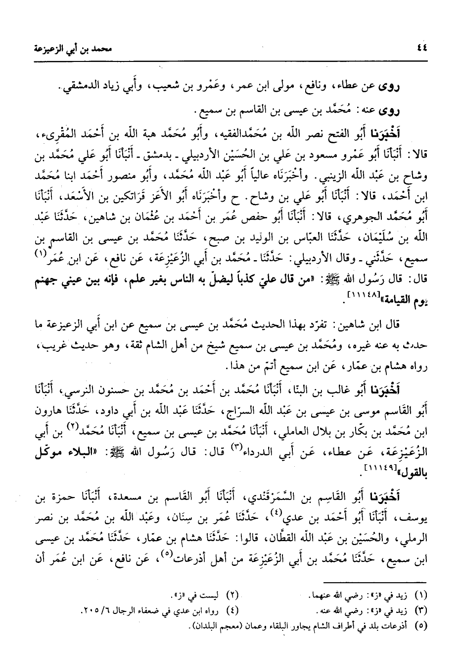[11149] أخبرنا أبو القاسم بن السمرقندي أنبأنا أبو القاسم بن مسعدة أنبأنا حمزة بن يوسف أنبأنا أبو أحمد بن عدي (4) حدثنا عمر بن سنان وعبد الله بن محمد بن نصر الرملي والحسين بن عبد الله القطان قالوا حدثنا هشام بن عمار حدثنا محمد بن عيسى ابن سميع حدثنا محمد بن أبي الزعيزعة من أهل أذرعات (5) عن نافع عن ابن عمر أن