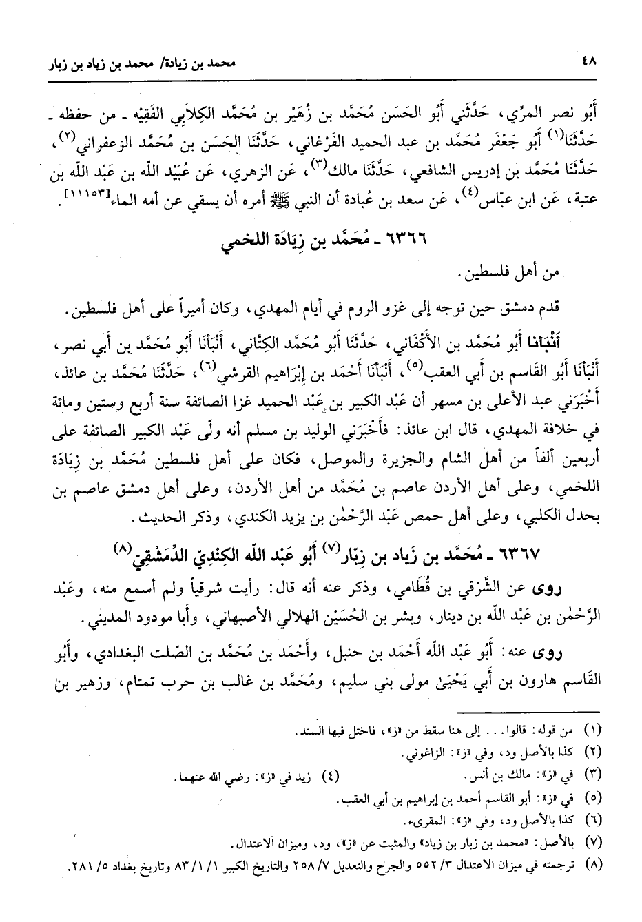 6367 - محمد بن زياد بن زبار (7) أبو عبد الله الكندي الدمشقي (8) روى عن الشرقي بن قطامي وذكر عنه أنه قال رأيت شرقيا ولم أسمع منه وعبد الرحمن بن عبد الله بن دينار وبشر بن الحسين الهلالي الأصبهاني وأبا مودود المديني روى عنه أبو عبد الله أحمد بن حنبل وأحمد بن محمد بن الصلت البغدادي وأبو القاسم هارون بن أبي يحيى مولى بني سليم ومحمد بن غالب بن حرب تمتام وزهير بن