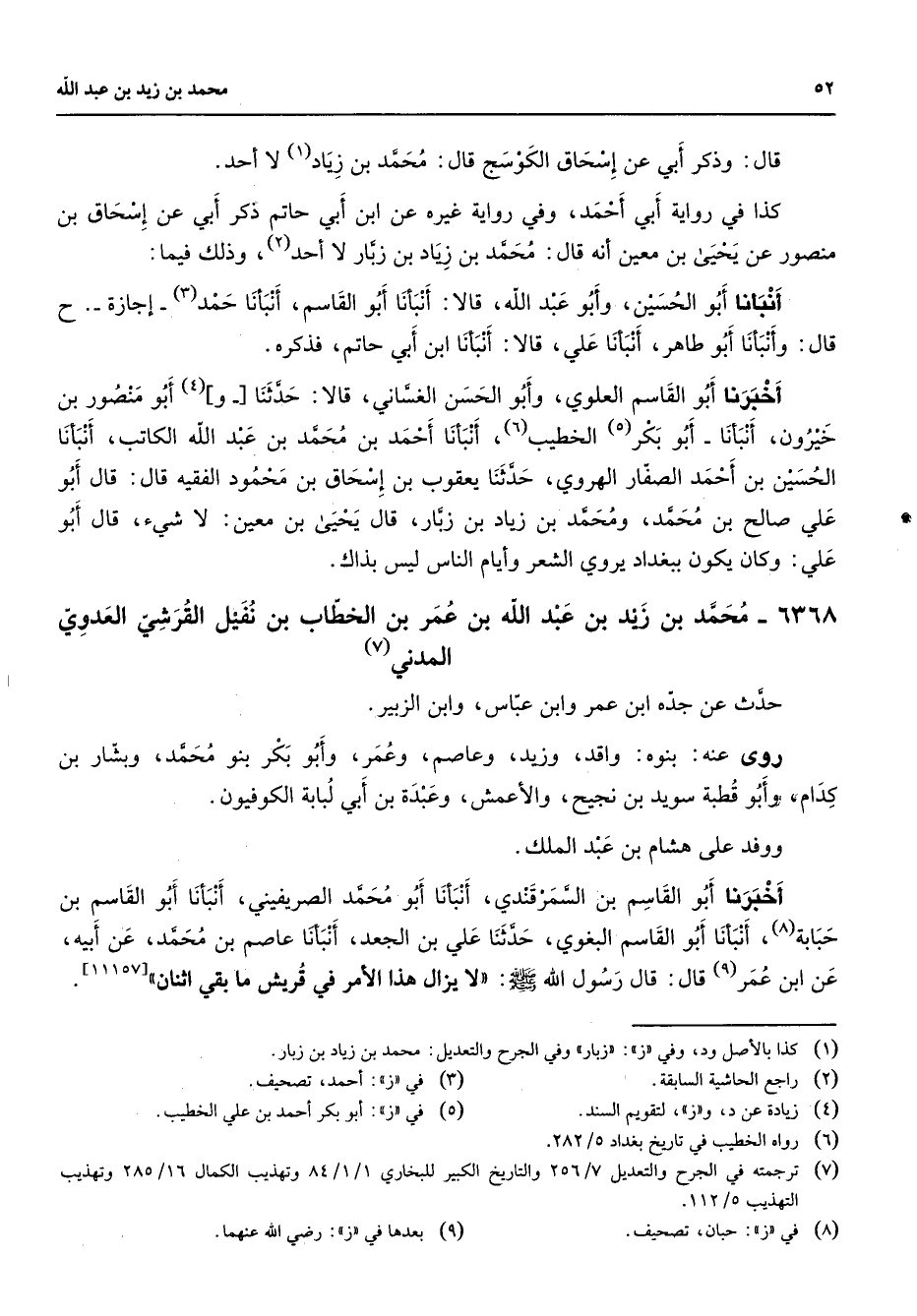 6368 - محمد بن زيد بن عبد الله بن عمر بن الخطاب بن نفيل القرشي العدوي المدني (7) حدث عن جده ابن عمر وابن عباس وابن الزبير روى عنه بنوه واقد وزيد وعاصم وعمر وأبو بكر بنو محمد وبشار بن كدام وأبو قطبة سويد بن نجيح والأعمش وعبدة بن أبي لبابة الكوفيون ووفد على هشام بن عبد الملك أخبرنا أبو القاسم بن السمرقندي أنبأنا أبو محمد الصريفيني أنبأنا أبو القاسم بن حبابة (8) أنبأنا أبو القاسم البغوي حدثنا علي بن الجعد أنبأنا عاصم بن محمد عن أبيه عن ابن عمر (9) قال قال رسول الله (صلى الله عليه وسلم) لا يزال هذا الأمر في قريش ما بقي اثنان