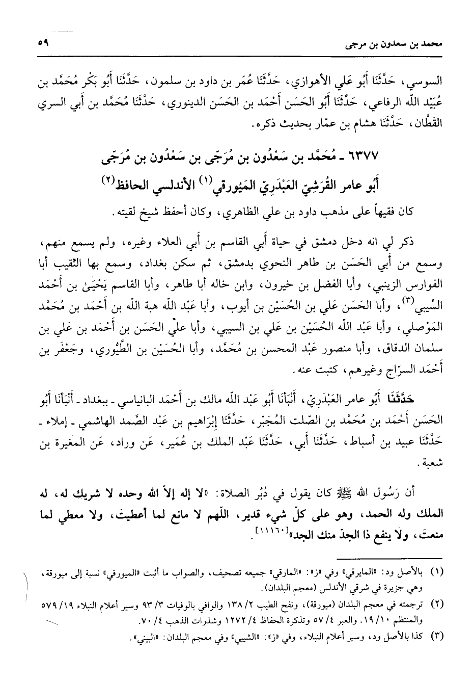 السوسي حدثنا أبو علي الأهوازي حدثنا عمر بن داود بن سلمون حدثنا أبو بكر محمد بن عبيد الله الرفاعي حدثنا أبو الحسن أحمد بن الحسن الدينوري حدثنا محمد بن أبي السري القطان حدثنا هشام بن عمار بحديث ذكره 6377 محمد بن سعدون بن مرجى بن سعدون بن مرجى أبو عامر القرشي العبدري الميورقي (1) الأندلسي الحافظ (2) كان فقيها على مذهب داود بن علي الظاهري وكان أحفظ شيخ لقيته ذكر لي انه دخل دمشق في حياة أبي القاسم بن أبي العلاء وغيره ولم يسمع منهم وسمع من أبي الحسن بن طاهر النحوي بدمشق ثم سكن بغداد وسمع بها النقيب أبا الفوارس الزينبي وأبا الفضل بن خيرون وابن خاله أبا طاهر وأبا القاسم يحيى بن أحمد السيبي (3) وأبا الحسن علي بن الحسين بن أيوب وأبا عبد الله هبة الله بن أحمد بن محمد الموصلي وأبا عبد الله الحسين بن علي بن السيبي وأبا علي الحسن بن أحمد بن علي بن سلمان الدقاق وأبا منصور عبد المحسن بن محمد وأبا الحسين بن الطيوري وجعفر بن أحمد السراج وغيرهم كتبت عنه حدثنا أبو عامر العبدري أنبأنا أبو عبد الله مالك بن أحمد البانياسي ببغداد أنبأنا أبو الحسن أحمد بن محمد بن الصلت المجبر حدثنا إبراهيم بن عبد الصمد الهاشمي إملاء حدثنا عبيد بن أسباط حدثنا أبي حدثنا عبد الملك بن عمير عن وراد عن المغيرة بن شعبة أن رسول الله (صلى الله عليه وسلم) كان يقول في دبر الصلاة لا إله إلا الله وحده لا شريك له له الملك وله الحمد وهو على شئ قدير اللهم لا مانع لما أعطيت ولا معطي لما منعت ولا ينفع ذا الجد منك الجد