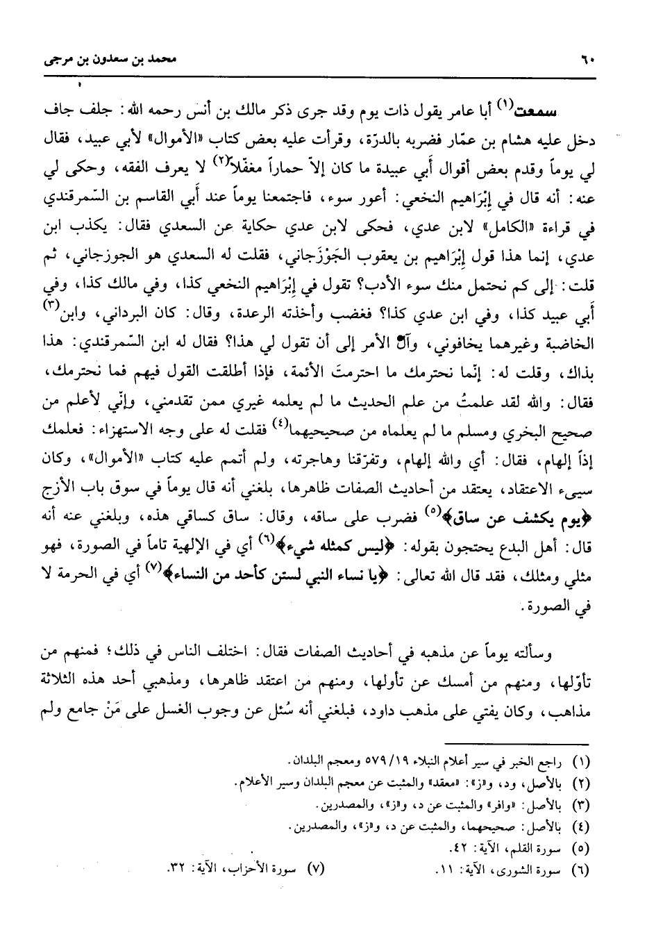 سمعت (1) أبا عامر يقول ذات يوم وقد جرى ذكر مالك بن أنس رحمه الله جلف جاف عليه هشام بن عمار فضربه بالدرة وقرأت عليه بعض كتاب الأموال لأبي عبيد فقال لي يوما وقدم بعض أقوال أبي عبيدة ما كان إلا حمارا مغفلا (2) لا يعرف الفقه وحكى لي عنه أنه قال في إبراهيم النخعي أعور سوء فاجتمعنا يوما عند أبي القاسم بن السمرقندي في قراءة الكامل لابن عدي فحكى لابن عدي حكاية عن السعدي فقال يكذب ابن عدي إنما هذا قول إبراهيم بن يعقوب الجوزجاني فقلت له السعدي هو الجوزجاني ثم قلت إلى كم نحتمل منك سوء الأدب تقول في إبراهيم النخعي كذا وفي مالك كذا وفي أبي عبيد كذا وفي ابن عدي كذا فغضب وأخذته الرعدة وقال كان البرداني وابن (3) الخاضبة وغيرهما يخافوني وآل الأمر إلى أن تقول لي هذا فقال له ابن السمرقندي هذا بذاك وقلت له إنما نحترمك ما احترمت الأئمة فإذا أطلقت القول فيهم فما نحترمك فقال والله لقد علمت من علم الحديث ما لم يعلمه غيري ممن تقدمني وإني لأعلم من صحيح البخاري ومسلم ما لم يعلماه من صحيحيهما (4) فقلت له على وجه الاستهزاء فعلمك إذا إلهام فقال أي والله إلهام وتفرقنا وهاجرته ولم أتمم عليه كتاب الأموال وكان سيئ الاعتقاد يعتقد من أحاديث الصفات ظاهرها بلغني أنه قال يوما في سوق باب الأزج " يوم يكشف عن ساق " (5) فضرب على ساقه وقال ساق كساقي هذه وبلغني عنه أنه قال أهل البدع يحتجون بقوله " ليس كمثله شئ " (6) أي في الإلهية تاما في الصورة فهو مثلي ومثلك فقد قال الله تعالى " يا نساء النبي لستن كأحد من النساء " (7) أي في الحرمة لا في الصورة وسألته يوما عن مذهبه في أحاديث الصفات فقال اختلف الناس في ذلك فمنهم من تأولها ومنهم من أمسك عن تأولها ومنهم من اعتقد ظاهرها ومذهبي أحد هذه الثلاثة مذاهب وكان يفتي على مذهب داود فبلغني أنه سئل عن وجوب الغسل على من جامع ولم