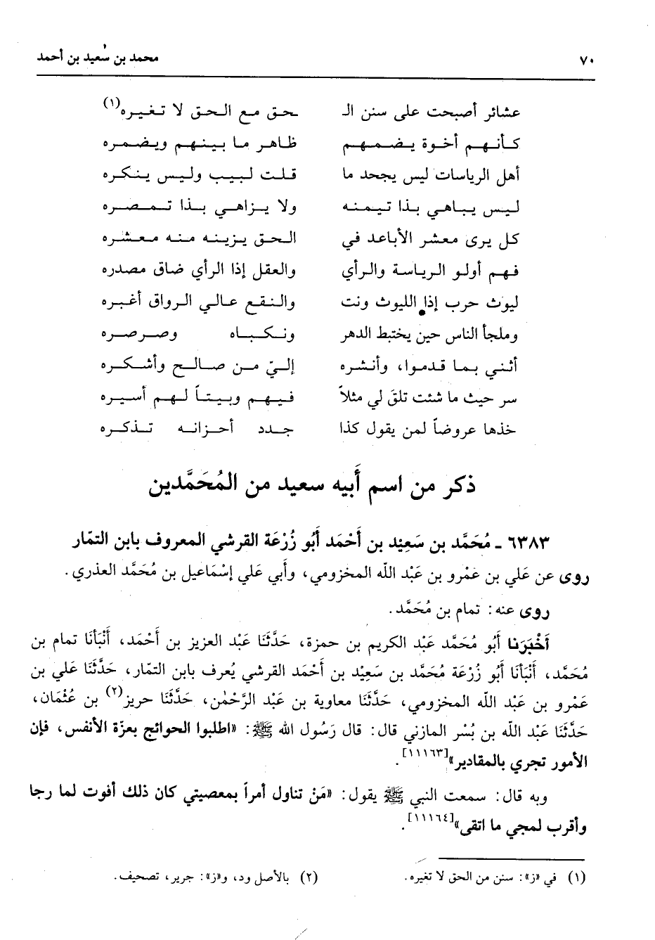 عشائر أصبحت على سنن ال * حق مع الحق لا تغيره (1) كأنهم أخوة يضمهم * ظاهر ما بينهم ويضمره أهل الرياسات ليس يجحد ما * قلت لبيب وليس ينكره ليس يباهي بذا تيمنه * ولا يزاهي بذا تمصره كل يرى معشر الأباعد في * الحق يزينه منه معشره * * فهم أولو الرياسة والرأي * والعقل إذا الرأي ضاق مصدره ليوث حرب إذا الليوث ونت * والنقع عالي الرواق أغبره وملجأ الناس حين يختبط الدهر * ونكباه وصرصره أثني بما قدموا وأنشره * إلي من صالح وأشكره سر حيث ما شئت تلق لي مثلا * فيهم وبيتا لهم أسيره خذها عروضا لمن يقول كذا * جدد أحزانه تذكره * " ذكر من اسم أبيه سعيد من المحمدين "