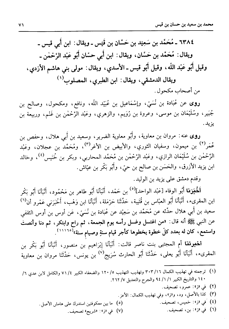 6384 - محمد بن سعيد بن حسان بن قيس ويقال ابن أبي قيس ويقال محمد بن حسان ويقال ابن أبي حسان أبو عبد الرحمن وقيل أبو عبد الله وقيل أبو قيس الأسدي ويقال مولى بني هاشم الأزدي ويقال الدمشقي ويقال ابن الطبري المصلوب (1) من أصحاب مكحول روى عن عبادة بن نسي وإسماعيل بن عبيد الله ونافع ومكحول وصالح بن جبير وسليمان بن موسى وعروة بن رويم والزهري وعبد الرحمن بن غنم وربيعة بن يزيد روى عنه مروان بن معاوية وأبو معاوية الضرير وسعيد بن أبي هلا وحفص بن عمر (2) بن ميمون وسفيان الثوري والأبيض بن الأغر (3) ومحمد بن عجلان وعبد الرحمن بن سليمان الرازي وعبد الرحمن بن محمد المحاربي وبكر بن خنيس (4) وخالد ابن يزيد الأزرق والحسن بن صالح بن حي وأبو بكر بن عياش وقدم دمشق على يزيد بن الوليد أخبرنا أبو الوفاء عبد الواحد (5) بن حمد أنبأنا أبو طاهر بن محمود أنبأنا أبو بكر ابن المقرئ أنبأنا أبو العباس بن قتيبة حدثنا حرملة أنبأنا ابن وهب أخبرني عمرو أن (6) سعيد بن أبي هلال حدثه عن محمد بن سعيد عن عبادة بن نسي عن أوس بن أوس الثقفي عن النبي (صلى الله عليه وسلم) أنه قال من اغتسل وغسل رأسه يوم الجمعة ثم راح وابتكر ثم دنا وأنصت واستمع كان له بعدد كل خطوة يخطوها كأجر قيام سنة وصيام سنة