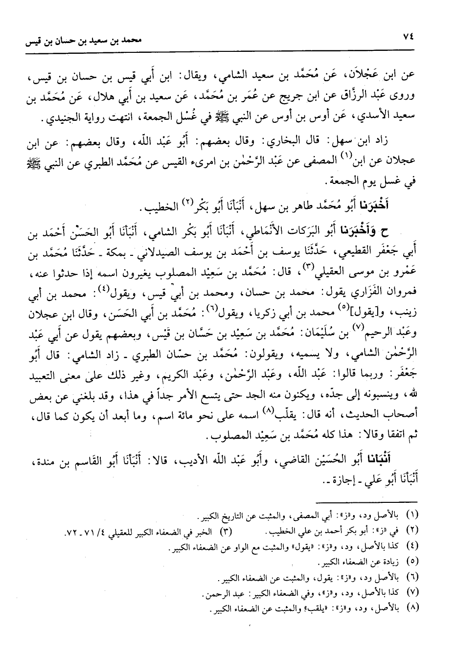 ابن عجلان عن محمد بن سعيد الشامي ويقال ابن أبي قيس بن حسان بن قيس وروى عبد الرزاق عن ابن جريج عن عمر بن محمد عن سعيد بن أبي هلال عن محمد بن سعيد الأسدي عن أوس بن أوس عن النبي (صلى الله عليه وسلم) في غسل الجمعة انتهت رواية الجنيدي زاد ابن سهل قال البخاري وقال بعضهم أبو عبد الله وقال بعضهم عن ابن عجلان عن ابن المصفى عن عبد الرحمن بن امرئ القيس عن محمد الطبري عن النبي (صلى الله عليه وسلم) في غسل يوم الجمعة أخبرنا أبو محمد طاهر بن سهل أنبأنا أبو بكر (2) الخطيب ح وأخبرنا أبو البركات الأنماطي أنبأنا أبو بكر الشامي أنبأنا أبو الحسن أحمد بن أبي جعفر القطيعي (3) حدثنا يوسف بن أحمد بن يوسف الصيدلاني بمكة حدثنا محمد بن عمرو بن موسى العقيلي قال محمد بن سعيد المصلوب يغيرون اسمه إذا حدثوا عنه فمروان الفزاري يقول محمد بن حسان ومحمد بن أبي قيس ويقول (4) محمد بن أبي زينب ويقول (5) محمد بن أبي زكريا ويقول (6) محمد بن أبي الحسن وقال ابن عجلان وعبد الرحيم (7) بن سليمان محمد بن سعيد بن حسان بن قيس وبعضهم يقول عن أبي عبد الرحمن الشامي ولا يسميه ويقولون محمد بن حسان الطبري زاد الشامي قال أبو جعفر وربما قالوا عبد الله وعبد الرحمن وعبد الكريم وغير ذلك على معنى التعبيد لله وينسبونه إلى جده ويكنون منه الجد حتى يتسع الأمر جدا في هذا وقد بلغني عن بعض أصحاب الحديث أنه قال يقلب (8) اسمه على نحو مائة اسم وما أبعد أن يكون كما قال ثم اتفقا وقالا هذا كله محمد بن سعيد المصلوب أنبأنا أبو الحسين القاضي وأبو عبد الله الأديب قالا أنبأنا أبو القاسم بن مندة أنبأنا أبو علي إجازة (1) بالاصل ود و (ز) أبي المصفى: والمثبت عن التاريخ الكبير