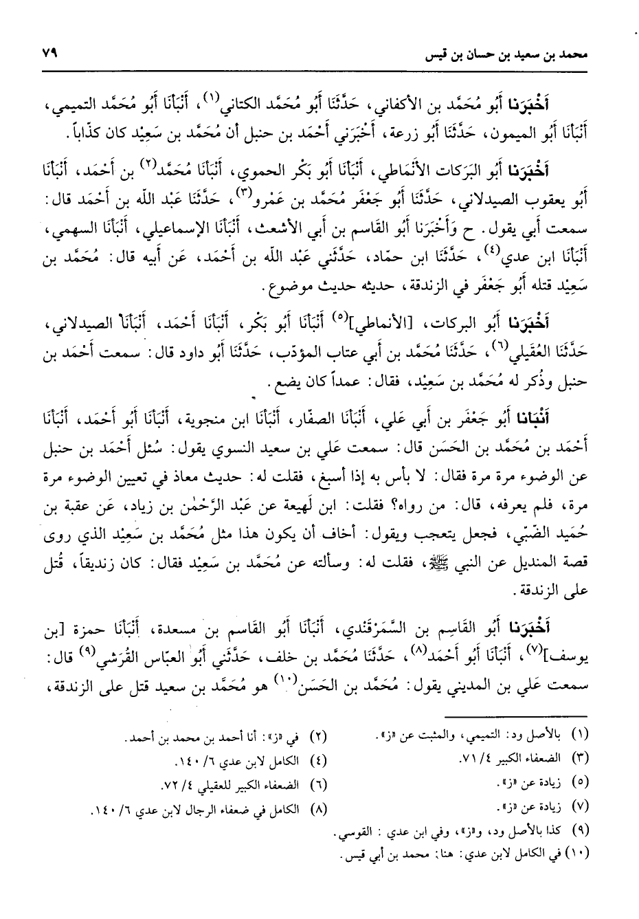 أخبرنا أبو محمد بن الأكفاني حدثنا أبو محمد الكتاني (1) أنبأنا أبو محمد التميمي أنبأنا أبو الميمون حدثنا أبو زرعة أخبرني أحمد بن حنبل أن محمد بن سعيد كان كذابا أخبرنا أبو البركات الأنماطي أنبأنا أبو بكر الحموي أنبأنا محمد (2) بن أحمد أنبأنا أبو يعقوب الصيدلاني حدثنا أبو جعفر محمد بن عمرو (3) حدثنا عبد الله بن أحمد قال معت أبي يقول وأخبرنا أبو القاسم بن أبي الأشعث أنبأنا الإسماعيلي أنبأنا السهمي أنبأنا ابن عدي (4) حدثنا ابن حماد حدثني عبد الله بن أحمد عن أبيه قال محمد بن سعيد قتله أبو جعفر في الزندقة حديثه حديث موضوع أخبرنا أبو البركات الأنماطي (5) أنبأنا أبو بكر أنبأنا أحمد أنبأنا الصيدلاني حدثنا العقيلي (6) حدثنا محمد بن أبي عتاب المؤدب حدثنا أبو داود قال سمعت أحمد بن حنبل وذكر له محمد بن سعيد فقال عمدا كان يضع أنبأنا أبو جعفر بن أبي علي أنبأنا الصفار أنبأنا ابن منجوية أنبأنا أبو أحمد أنبأنا أحمد بن محمد بن الحسن قال سمعت علي بن سعيد النسوي يقول سئل أحمد بن حنبل عن الوضوء مرة مرة فقال لا بأس به إذا أسبغ فقلت له حديث معاذ في تعيين الوضوء مرة مرة فلم يعرفه قال من رواه فقلت ابن لهيعة عن عبد الرحمن بن زياد عن عقبة بن حميد الضبي فجعل يتعجب ويقول أخاف أن يكون هذا مثل محمد بن سعيد الذي روى قصة المنديل عن النبي (صلى الله عليه وسلم) فقلت له وسألته عن محمد بن سعيد فقال كان زنديقا قتل على الزندقة أخبرنا أبو القاسم بن السمرقندي أنبأنا أبو القاسم بن مسعدة أنبأنا حمزة بن يوسف (7) أنبأنا أبو أحمد (8) حدثنا محمد بن خلف حدثني أبو العباس القرشي (9) قال سمعت علي بن المديني يقول محمد بن الحسن (10) هو محمد بن سعيد قتل على الزندقة