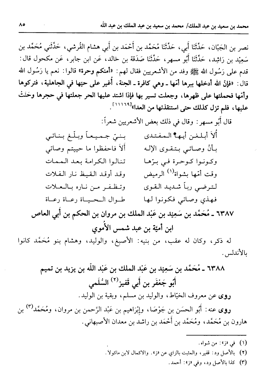 نصر بن الجبان حدثنا أبي حدثنا محمد بن أبي أحمد بن ابي هشام القرشي حدثني محمد بن سعيد بن راشد حدثنا أبو مسهر حدثنا صدقة بن خالد عن ابن جابر عن مكحول قال قدم على رسول الله (صلى الله عليه وسلم) وفد من الأشعريين فقال لهم أمنكم وحرة قالوا نعم يا رسول الله قال فإن الله أدخلها ببرها أمها وهي كافرة الجنة أغير على حيها في الجاهلية فتركوها وأمها فحملتها على ظهرها وجعلت تسير بها فإذا اشتد عليها الحر جعلتها في حجرها وحنت عليها فلم تزل كذلك حتى استنقذتها من العدا [11169 *] قال أبو مسهر وقال في ذلك بعض الأشعريين شعرا * ألا أبلغن أيها المفتدى * بني جميعا وبلغ بناتي * * بأن وصاتي بتقوى الإله * ألا فاحفظوا ما حييتم وصاتي وكونوا كوحرة في برها * تنالوا الكرامة بعد الممات وقت أمها بشواة الرميض * وقد أوقد القيظ نار الفلات * لترضي ربا شديد القوى * وتظفر من ناره بالعلات فهذى وصاتي فكونوا لها * طوال الحياة رعاة رعاة * 6387 محمد بن سعيد بن عبد الملك بن مروان بن الحكم بن أبي العاص ابن أمية بن عبد شمس الأموي له ذكر وكان له عقب من بنيه الأصبغ والوليد وهشام بنو محمد كانوا بالأندلس 6388 محمد بن سعيد بن عبد الملك بن عبد الله بن يزيد بن تميم أبو جعفر بن أبي قفيز (2) السلمي روى عن معروف الخياط والوليد بن مسلم وبقية بن الوليد روى عنه أبو الحسن بن جوصا وإبراهيم بن عبد الرحمن بن مروان ومحمد بن هارون بن محمد (3) ومحمد بن أحمد بن راشد بن معدان الأصبهاني