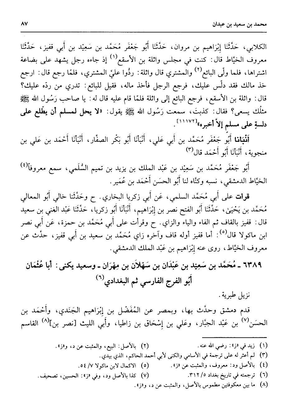 6389 - محمد بن سعيد بن عبدان بن سهلان بن مهران وسعيد يكنى أبا عثمان أو الفرج الفارسي ثم البغدادي (6) نزيل طبرية قدم دمشق وحدث بها وبمصر عن المفضل بن إبراهيم الجندي وأحمد بن الحسن (7) بن عبد الجبار وعلي بن إسحاق بن زاطيا وأبي الليث نصر بن (8) القاسم