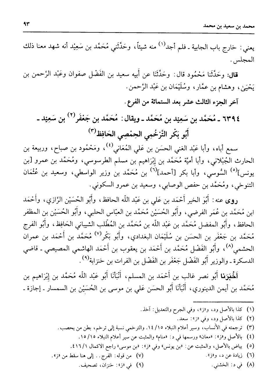 6394 - محمد بن سعيد بن محمد ويقال محمد بن جعفر (2) بن سعيد أبو بكر الترخمي الحمصي الحافظ (3) سمع أباه وأبا عبد الغني الحسن بن علي المعاني (4) ومحمود بن صباح وربيعة بن الحارث الجبلاني وأبا أمية محمد بن إبراهيم بن مسلم الطرسوسي ومحمد بن عمرو بن يونس (5) السوسي وأبا بكر أحمد (6) بن محمد بن وزير الواسطي وسعيد بن عثمان التنوخي ومحمد بن حفص الوصابي وسعيد بن عمرو السكوني روى عنه أبو الخير أحمد بن علي بن عبد الله الحافظ وأبو الحسين الرازي وأحمد ابن محمد بن عمر الفرضي وأبو الحسين محمد بن العباس الحلبي وأبو الحسين بن المظفر الحافظ وأبو المفضل محمد بن عبد الله بن محمد بن المطلب الشيباني الحافظ وأبو الفرج محمد بن جعفر بن الحسن بن سليمان البغدادي وأبو بكر (7) محمد بن أحمد بن عمران الحشمي (8) وأبو الفضل محمد بن أحمد بن يعقوب بن أحمد الهاشمي المصيصي قاضي الدسكرة والوزير أبو الفضل جعفر بن الفضل بن الفرات بن خنزابة (9) أخبرنا أبو نصر غالب بن أحمد بن المسلم أنبأنا أبو عبد الله بن إبراهيم بن محمد بن أيمن الدينوري أنبأنا أبو الحسن علي بن موسى بن الحسين بن السمسار إجازة