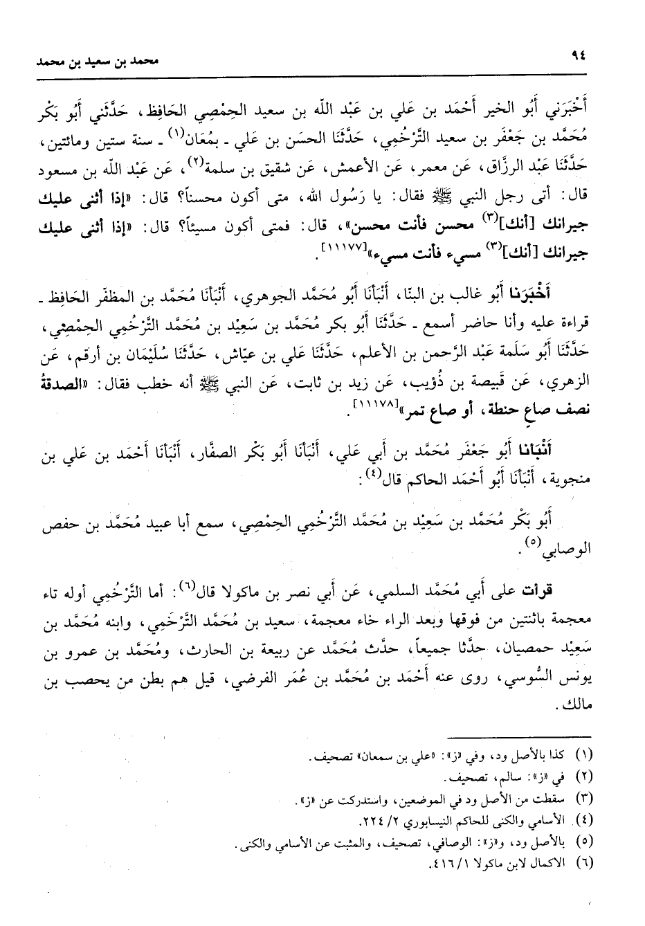 أخبرني أبو الخير أحمد بن علي بن عبد الله بن سعيد الحمصي الحافظ حدثني أبو بكر محمد بن جعفر بن سعيد الترخمي حدثنا الحسن بن علي بمعان (1) سنة ستين ومائتين حدثنا عبد الرزاق عن معمر عن الأعمش عن شقيق بن سلمة (2) عن عبد الله بن مسعود قال أتى رجل النبي (صلى الله عليه وسلم) فقال يا رسول الله متى أكون محسنا قال إذا أثنى عليك جيرانك أنك (3) محسن فأنت محسن قال فمتى أكون مسيئا قال إذا أثنى عليك جيرانك أنك (3) مسئ فأنت مسئ (11177) أخبرنا أبو غالب بن البنا أنبأنا أبو محمد الجوهري أنبأنا محمد بن المظفر الحافظ قراءة قراءة عليه وأنا حاضر أسمع حدثنا أبو بكر محمد بن سعيد بن محمد الترخمي الحمصي حدثنا أبو سلمة عبد الرحمن بن الأعلم حدثنا علي بن عياش حدثنا سليمان بن أرقم عن الزهري عن قبيصة بن ذؤيب عن زيد بن ثابت عن النبي (صلى الله عليه وسلم) أنه خطب فقال الصدقة نصف صاع حنطة أو صاع تمر