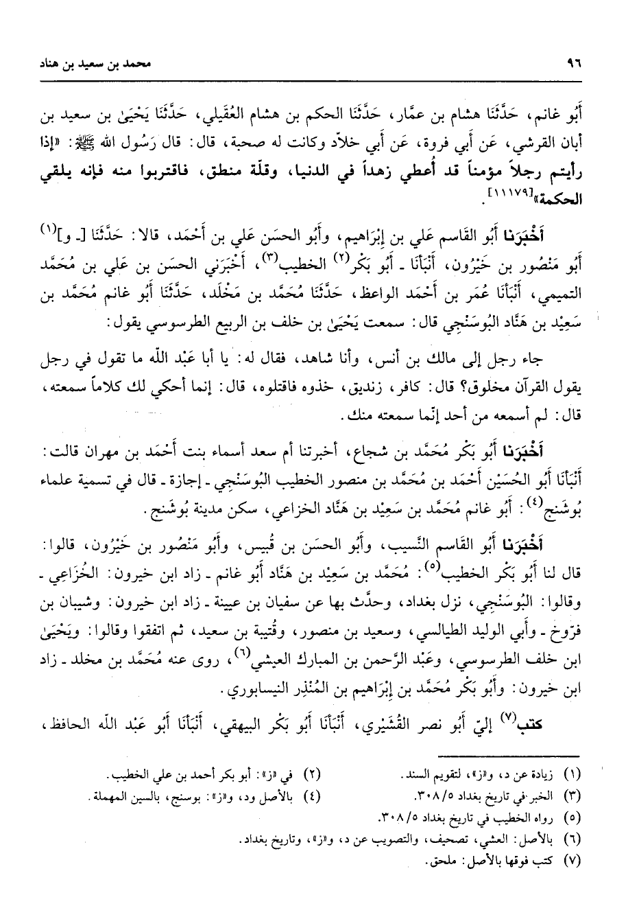 أبو غانم حدثنا هشام بن عمار حدثنا الحكم بن هشام العقيلي حدثنا يحيى بن سعيد بن أبان القرشي عن أبي فروة عن أبي خلاد وكانت له صحبة قال قال رسول الله (صلى الله عليه وسلم) إذا رأيتم رجلا مؤمنا قد أعطي زهدا في الدنيا وقلة منطق فاقتربوا منه فإنه يلقي الحكمة [11179 *] أخبرنا أبو القاسم علي بن إبراهيم وأبو الحسن علي بن أحمد قالا حدثنا و (1) أبو منصور بن خيرون أنبأنا أبو بكر (2) الخطيب (3) أخبرني الحسن بن علي بن محمد التميمي أنبأنا عمر بن أحمد الواعظ حدثنا محمد بن مخلد حدثنا أبو غانم محمد بن سعيد بن هناد البوسنجي قال سمعت يحيى بن خلف بن الربيع الطرسوسي يقول جاء رجل إلى مالك بن أنس وأنا شاهد فقال له يا أبا عبد الله ما تقول في رجل يقول القرآن مخلوق قال كافر زنديق خذوه فاقتلوه قال إنما أحكي لك كلاما سمعته قال لم أسمعه من أحد إنما سمعته منك أخبرنا أبو بكر محمد بن شجاع أخبرتنا أم سعد أسماء بنت أحمد بن مهران قالت أنبأنا أبو الحسين أحمد بن محمد بن منصور الخطيب البوسنجي إجازة قال في تسمية علماء بوشنج (4) أبو غانم محمد بن سعيد بن هناد الخزاعي سكن مدينة بوشنج أخبرنا أبو القاسم النسيب وأبو الحسن بن قبيس وأبو منصور بن خيرون قالوا قال لنا أبو بكر الخطيب (5) محمد بن سعيد بن هناد أبو غانم زاد ابن خيرون الخزاعي وقالوا البوسنجي نزل بغداد وحدث بها عن سفيان بن عيينة زاد ابن رون وقالوا البوسنجي نزل بغداد وحدث بها عن سفيان بن عيينة زاد ابن خيرون وشيبان بن فروخ وأبي الوليد الطيالسي وسعيد بن منصور وقتيبة بن سعيد ثم اتفقوا وقالوا ويحيى ابن خلف الطرسوسي وعبد الرحمن بن المبارك العيشي (6) روى عنه محمد بن مخلد زاد ابن خيرون وأبو بكر محمد بن إبراهيم بن المنذر النيسابوري كتب (7) إلي أبو نصر القشيري أنبأنا أبو بكر البيهقي أنبأنا أبو عبد الله الحافظ